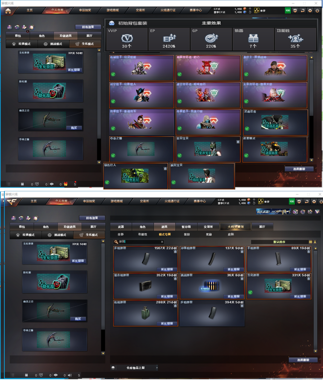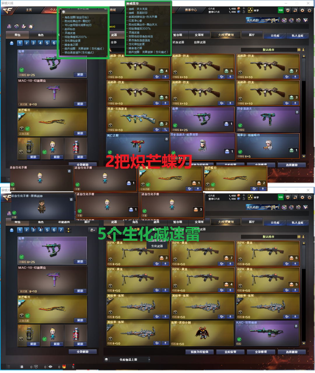 排位:可以-----------生化全装(生化背包、可以查看生化僵尸血量)无需换弹、6烈、6盘龙、6炼狱、异变清道夫-小人枪、双面神、KAC狂怒咆哮、异变清道夫、斯泰尔枪娘暗刃、毒蜂、死亡之眼、MAC涂鸦、2把炽芒蝶刃、4个生化减速雷、超级对讲机、全部弹匣、、、、、爆破四防:幻神12皮+音效(KZ、YZK、EP荣耀世冠、宠儿、24AG冠军、星耀、冠军之幻、白鲨、23白鲨、周瑜、青鹤、黄忠)、王者沧神、传说灵眸、98K星神带音效、王者风神、、、、EP荣耀柯尔特、USP雷暴王者、3个USP神工天巧、4个COP幻灵、竞技荣光柯尔特、冠军之特、23白鲨柯尔特、、、、神威天绫、传说夜影、八面凌龙、白虎玄豹、FAMAS G2-天戎、QBZ天罚、G36C幻影、白虎、白虎之魄、、、、幻神音效、星神音效、裁决音效、黑龙音效、、极光音效、蔷薇音效、白虎音效、毁灭音效、雷神音效、黑骑士音效、、、、生化人物(神威莲华、隼、王者沙漠玫瑰)、爆破四防人物很多