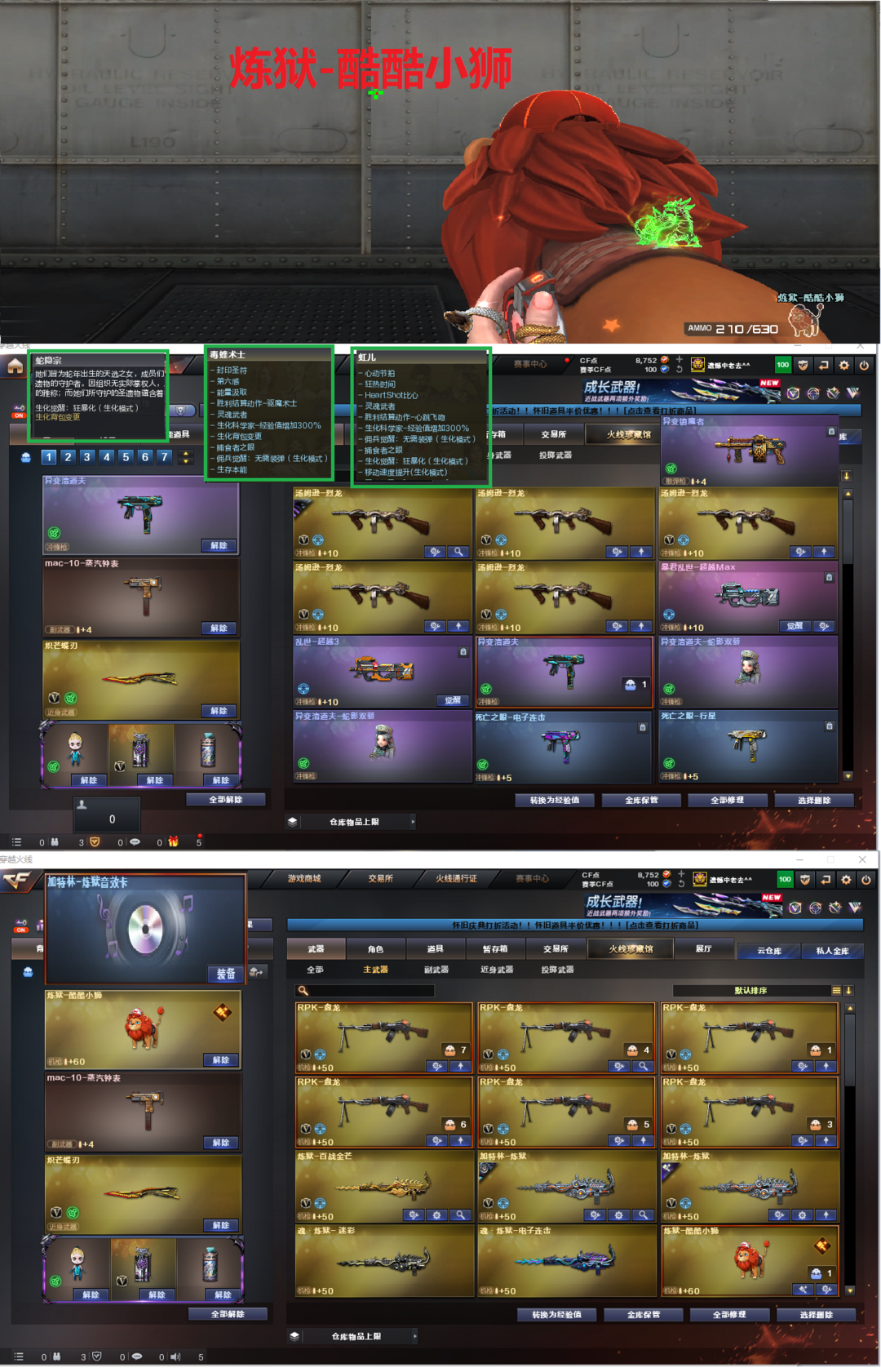 排位:可以-----------双清道夫-无限卡子弹-------生化四防全装(生化模式换背包、看血量):无需换弹、5烈、6盘龙、炼狱+炼狱音效、炼狱-酷酷小狮、异变清道夫、2个清道夫小人枪、异变镇魔者、死亡之眼、MAC涂鸦、炽芒蝶刃、手斧镜、生化减速雷、超级对讲机、全部弹匣、、、、、爆破四防:裁决+裁决音效、白虎QBZ蔷薇、玄豹左轮、、、裁决音效、白虎音效、炼狱印象、、、2套玄豹、、、生化四防(毒蝰术士、虹儿、蛇影宗)爆破四防(王者春)