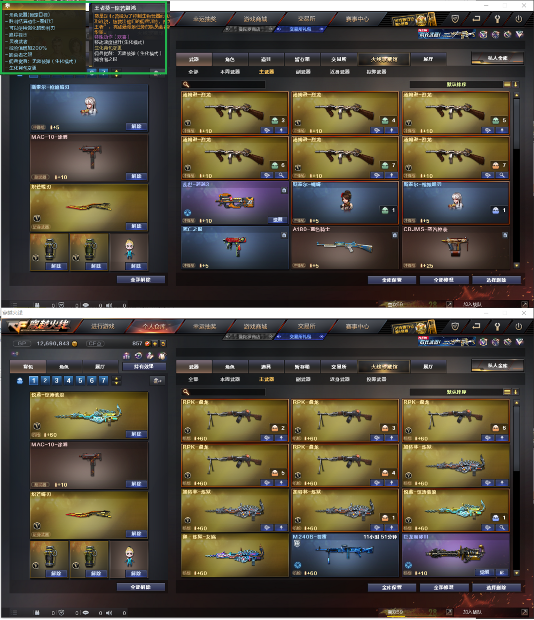 排位:可以、、、、、、、、、生化四防精品号(变更生化背包、可以查看僵尸血量)无需换弹、6盘6烈、炼狱、斯太尔蝴蝶、斯太尔枪娘暗刃、死亡之眼、MAC手枪、炽芒蝶刃、生化减速雷、超级对讲机、全部弹匣、、、、、、爆破四防:幻神音效、王者幻神(已觉醒)、USP雷暴、COP堕天神、COP云龙、柯尔特竞技荣光、星神、白虎、凌龙、王者白虎、王者蔷薇、、、幻神音效、毁灭音效、雷神音效、火麒麟音效、黑骑士音效、、、3套雷霆、3套雷暴、7套堕天神、1套夜魔、2套幻灵、1套云龙、、、、生化四防(隼、王者葵)、爆破四防(传说女帝、云悠悠、王者春、王者瞳、鹰)