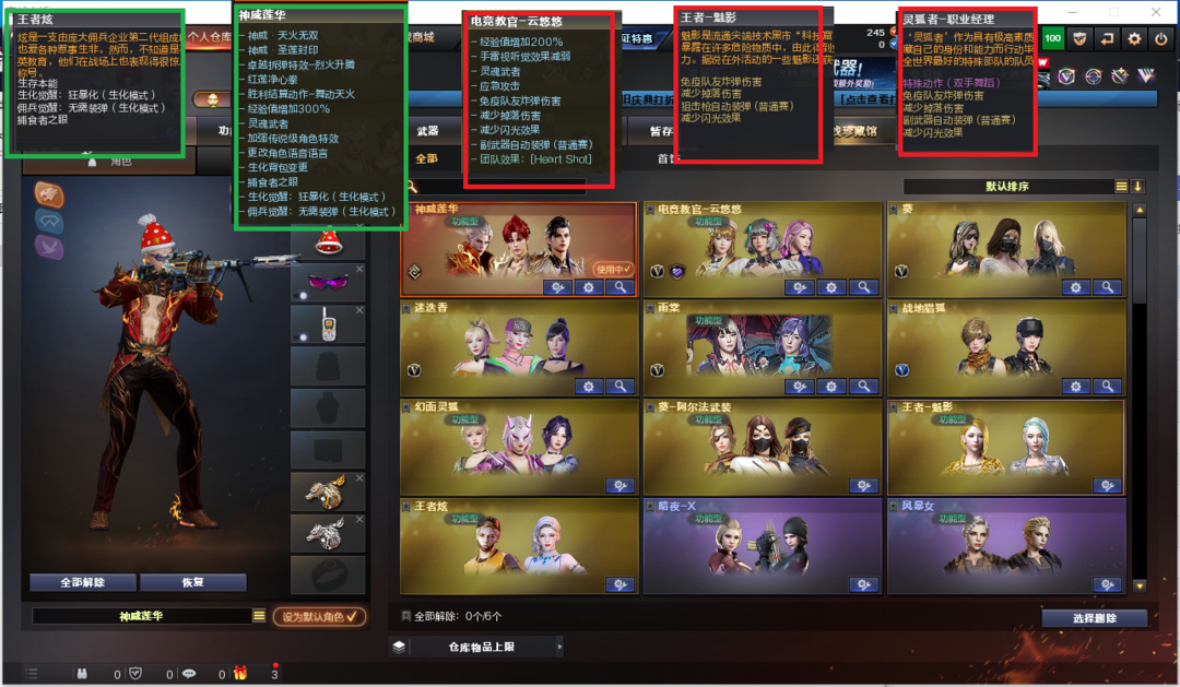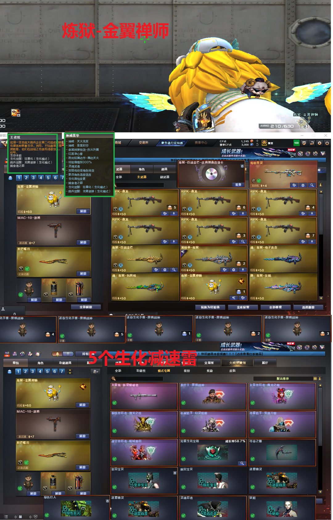 排位:可以、、、、、、、、、 、生化极品(背包变更、可以查看生化僵尸血量):无需换弹、6盘龙、炼狱-金翼禅师、传说圣灵、死亡之眼、MAC-涂鸦、炽芒蝶刃、5个生化减速雷、超级对讲机、全部弹匣、、、、、、、爆破四防:幻神音效(周瑜皮肤)、M200-竞技荣光、98K星神、USP雷暴、COP雷霆王者、柯尔特竞技荣光、COP幻灵、白虎、QBZ冠军蔷薇、、、幻神音效、裁决卡音效、蔷薇音效、白虎音效、极光音效、雷神音效、火麒麟音效、炼狱音效、、、4套堕天神、3套幻灵、1套竞技荣光、、、生化四防(神威莲华、王者炫)爆破四防(云悠悠、雨棠、王者魅影、葵-赛.博.朋.克、职业经理、樱-青春偶像)