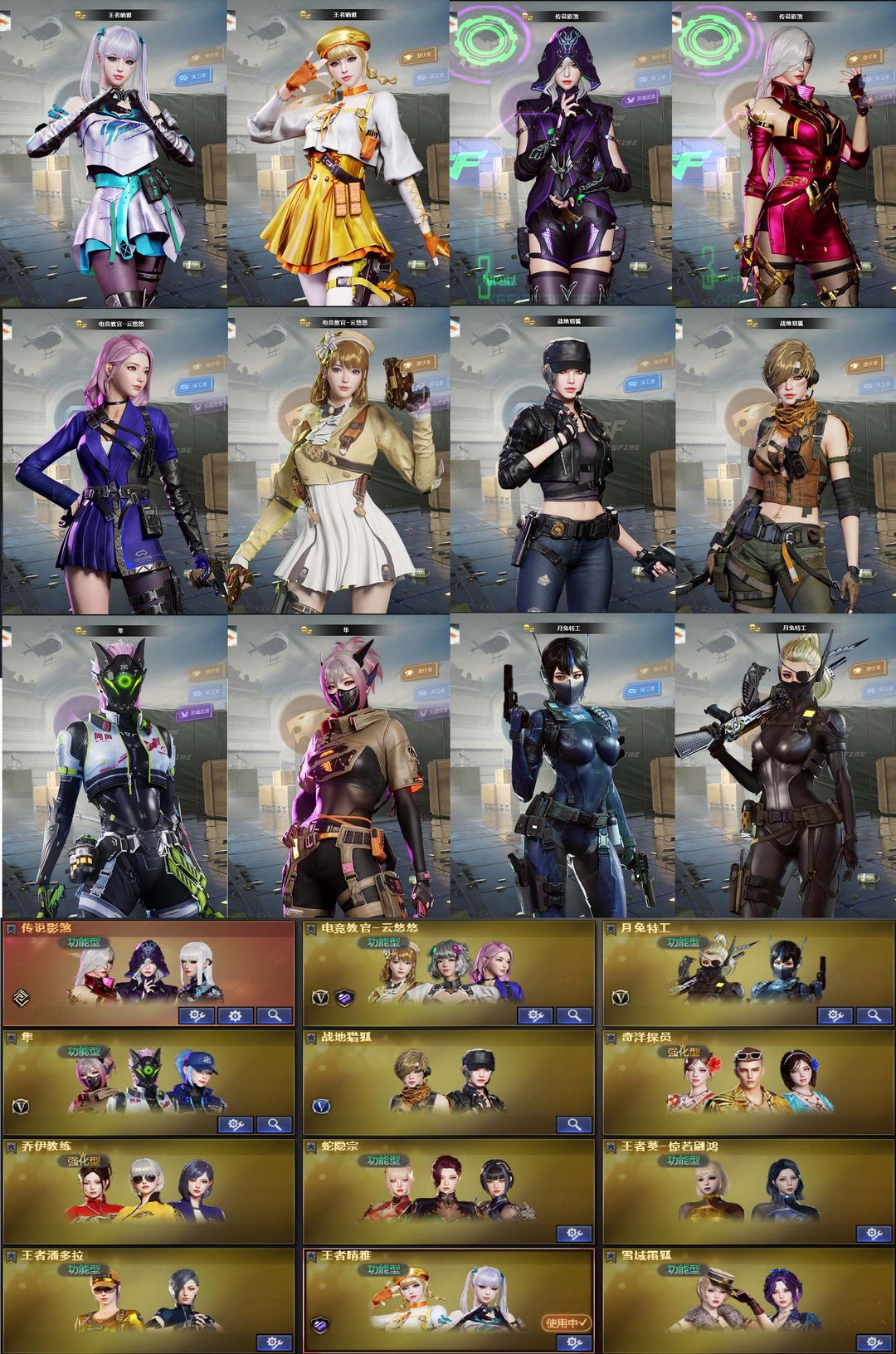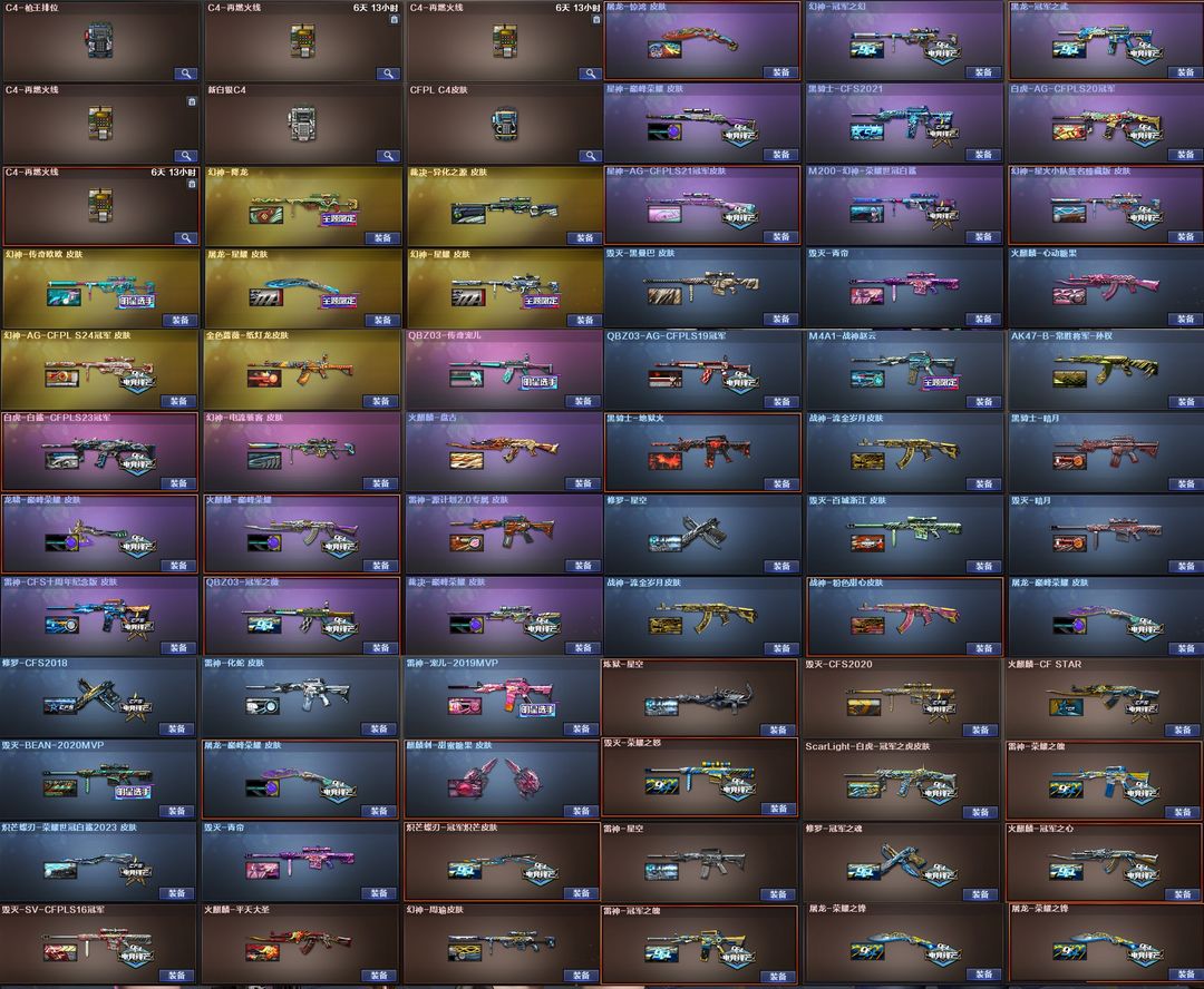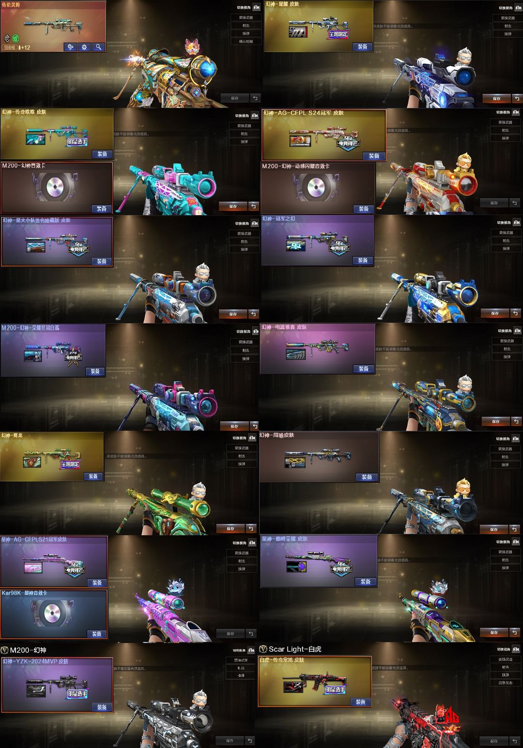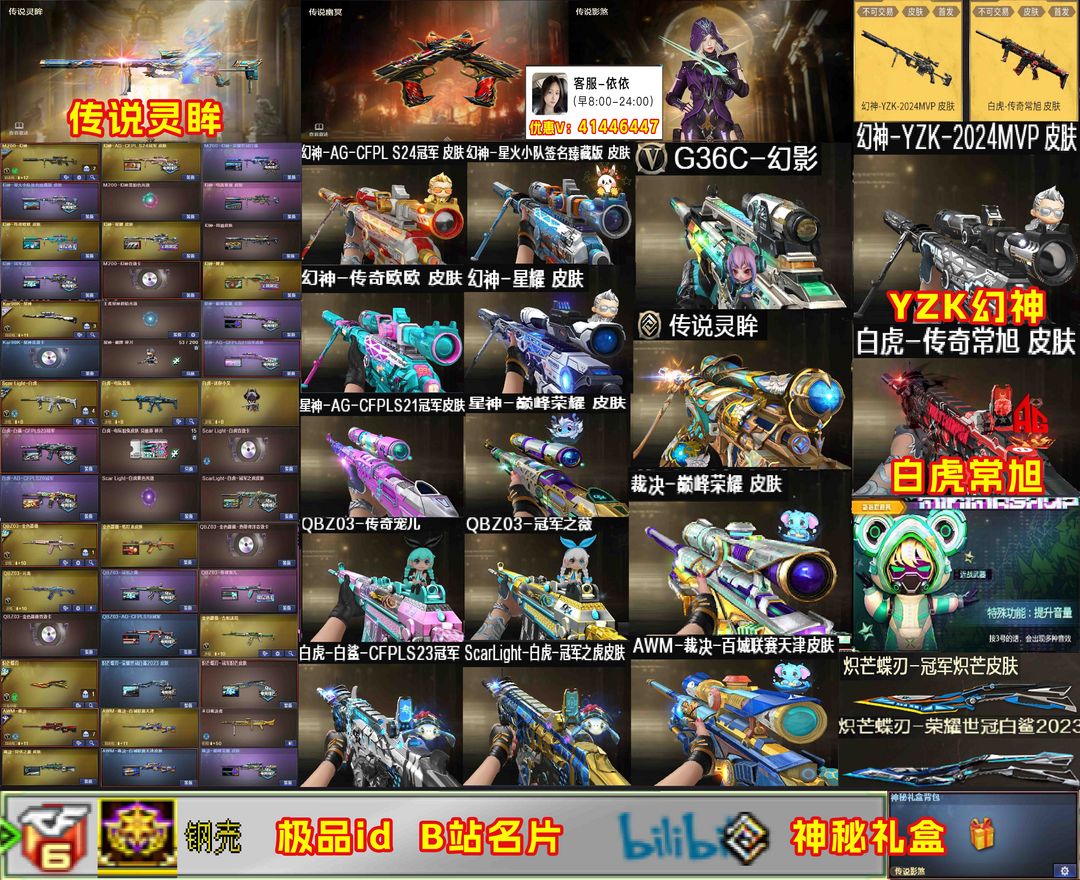 【装备道具】:Yzk幻神皮肤★白虎传奇常旭★神秘礼盒★B站名片★传说影煞/传说辉光/传说灵眸★幻神-电流骇客/幻神-星火小队签名臻藏版/幻神-AG-CFPL S24冠军/幻神-欧欧 皮肤/M200-幻神-荣耀世冠白鲨/幻神-冠军之幻/幻神-周瑜/幻神-降龙/幻神-星耀 皮肤/星神-巅峰荣耀/Kar98K-星神-AG-CFPLS21冠军/裁决-异化之源/AWM-裁决-百城联赛天津/裁决-巅峰荣耀/白虎-白鲨-CFPLS23冠军/ScarLight-白虎-冠军之虎皮肤/白虎-AG-CFPLS20冠军/QBZ03-AG-CFPLS19冠军/QBZ03-冠军之薇/QBZ03-传奇宠儿/炽芒蝶刃-荣耀世冠白鲨2023/炽芒蝶刃-冠军炽芒/M200-竞技荣光/98K-星神/AWM-裁决/COP-幻灵荣耀世冠-柯尔特/柯尔特-冠军之特(3)/柯尔特-竞技荣光/USP-雷暴/炽芒蝶刃/柯尔特-无冕之王/王者芳薇-觉醒版/王者霜心/白虎-迷你小艾/Cat-刀锋/毁灭-孙三炮/COP-白鲨/★竞技荣光套装★电竞教官-云悠悠/月兔特工/隼/王者晴雅/黄金猫猫手套-白鲨/Knife-冠军之刃/6盘龙炼狱