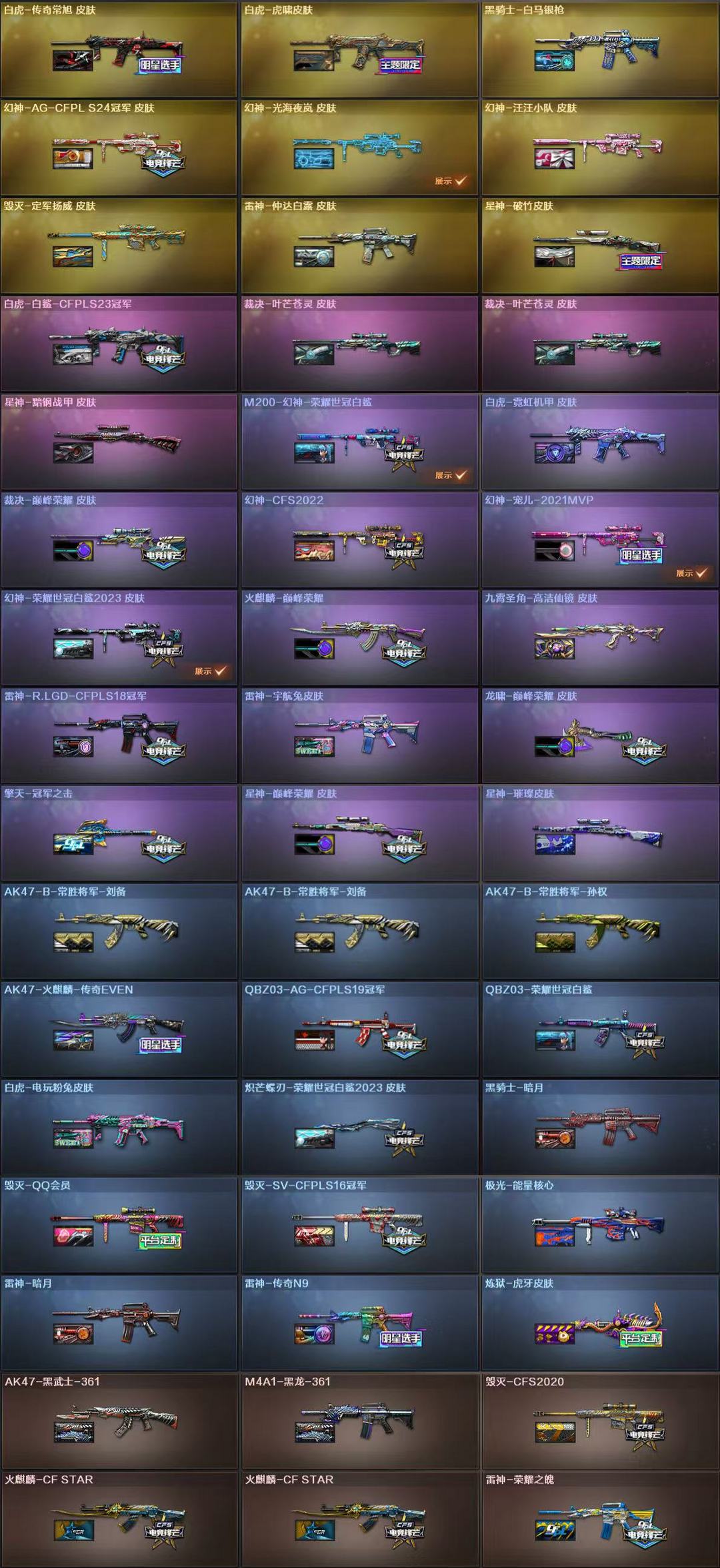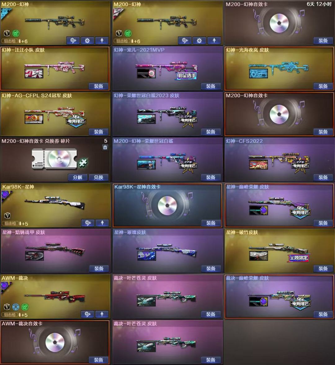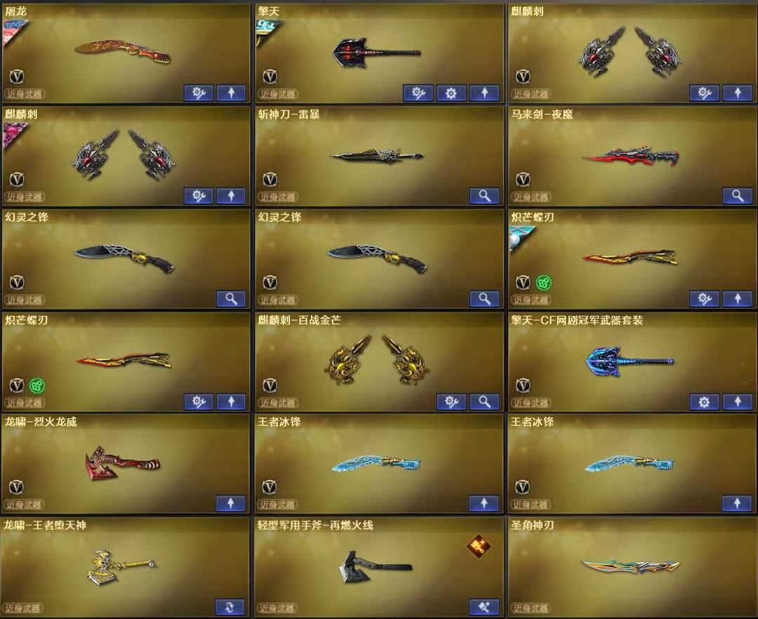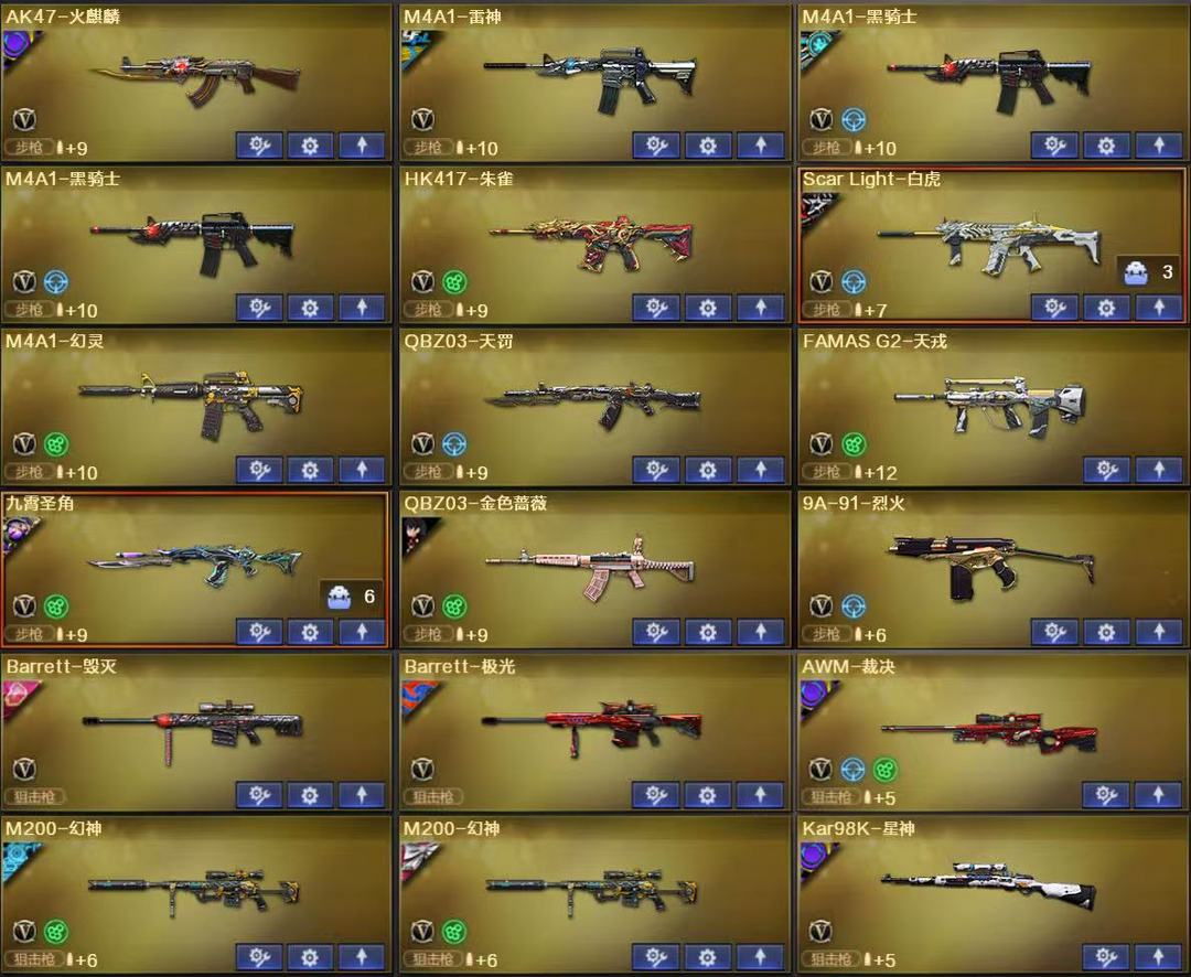 本游戏账号:英雄武器456个; 王者武器40个。 装备不多,但是主武器、副武器、近身武器够用 拥有完美游戏体验。重要的是,特殊装备有:M4A1-黑骑士、烟雾弹-神工天巧、闪光弹-神工天巧、高爆手雷-神工天巧、AK47-火麒麟、高爆手雷-竞技荣光、烟雾弹-竞技荣光、柯尔特-竞技荣光、荣耀世冠-柯尔特、荣耀世冠-龙啸、荣耀世冠-火麒麟、荣耀世冠-雷神、Kar98K-星神、M4A1-青龙、QBZ03-金色蔷薇、Scar Light-白虎、M4A1-雷神、HK417-朱雀、USP-雷暴、COP-堕天神、闪光弹-堕天神、烟雾弹-堕天神、M4A1-堕天神、龙啸-堕天神、麒麟刺-堕天神、Barrett-毁灭、M4A1-雷霆、雷霆之契、雷霆之锋、M200-幻神、Barrett-朱雀、麒麟刺、AA-12-雷霆、破空枪刃、QBZ95-幻兽、沙鹰-幻兽、AWM-天龙、M4A1-黑龙、加特林-炼狱、M4A1-玫瑰精灵、AK47-黑武士、王者之心-觉醒版、王者之锋-觉醒版、王者之光-觉醒版、雷霆王者之锋-