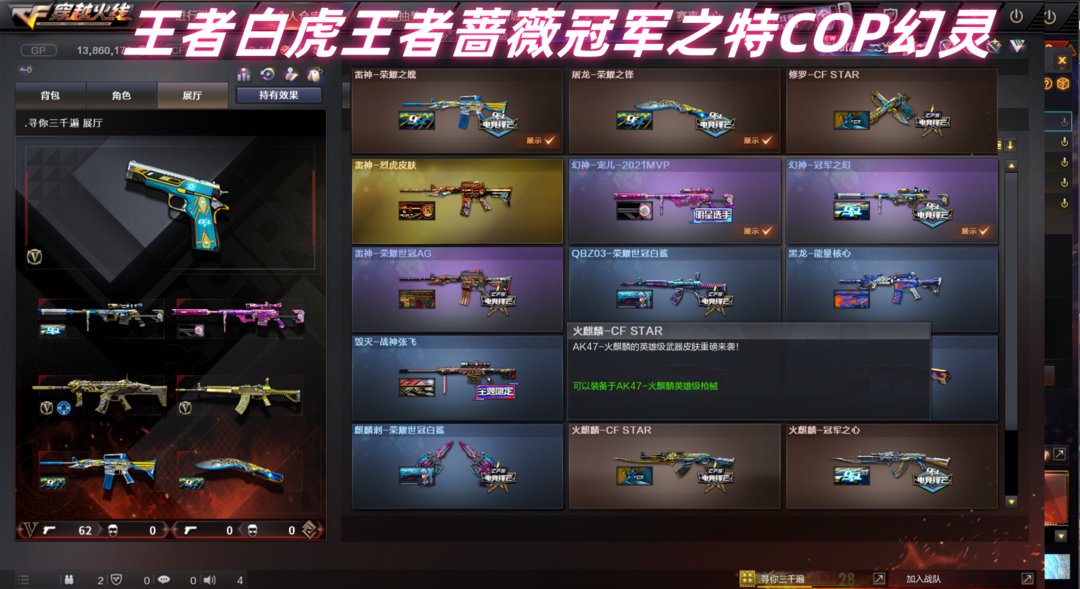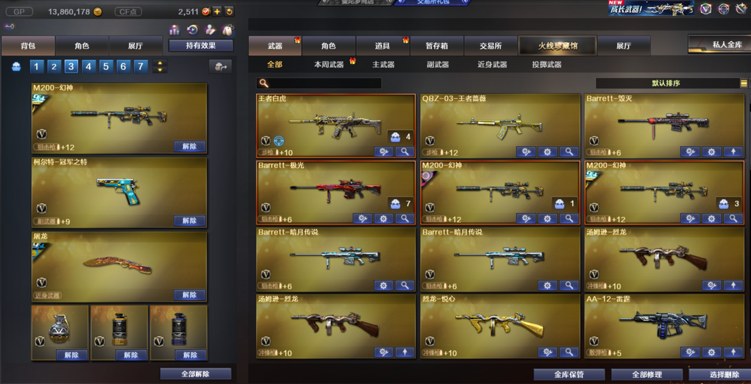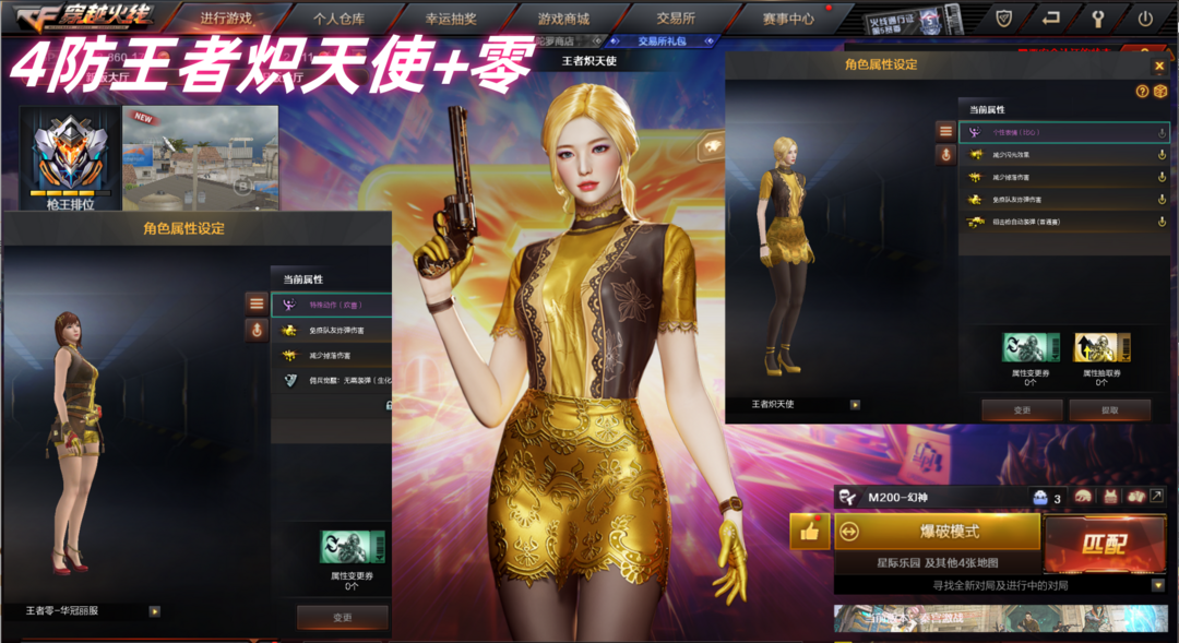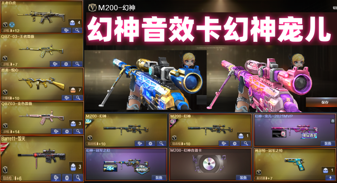 本游戏账号:M200-幻神宠儿、M4A1-玫瑰精灵、AK47-火麒麟、王者白虎-觉醒版、炫金毁灭、炫金天龙、堕天使、M200-幻神音效卡、王者之魄金色光效、等,随意畅选。