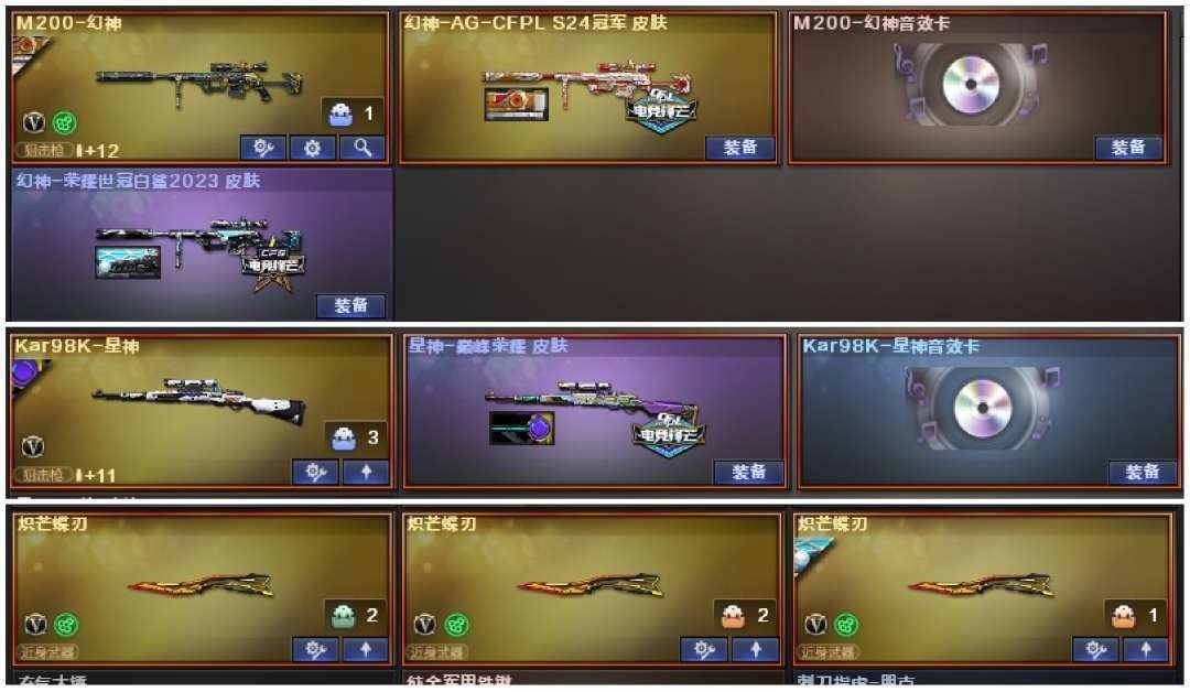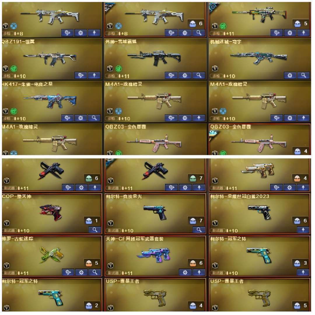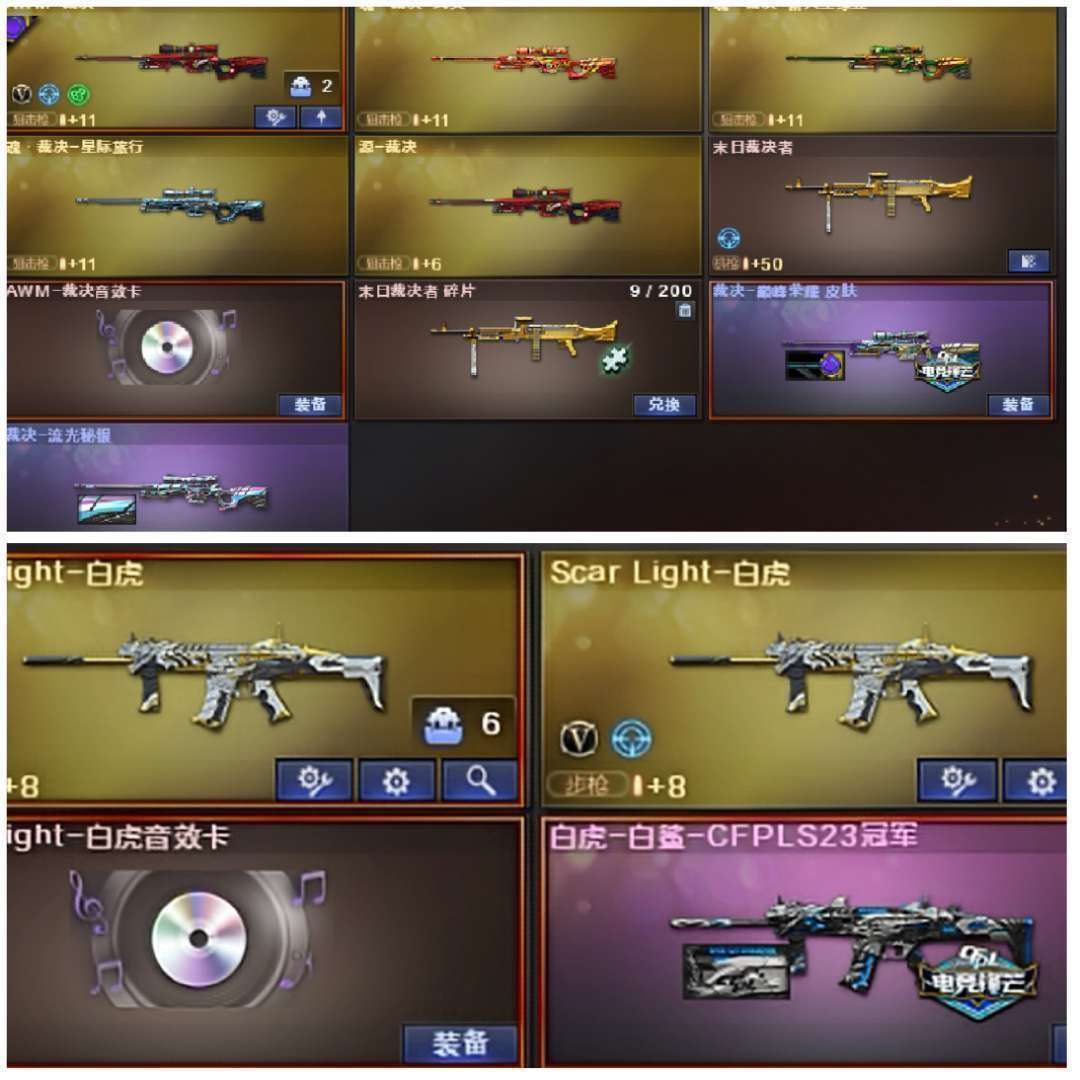 白鲨2023世冠全套。手枪拉满。。幻神星神裁决三件套,白虎QBZ雷神火麒麟三件套,金色ID。生化六烈六盘狮子龙宝。斯太尔蝴蝶,蝴蝶刀,满配。