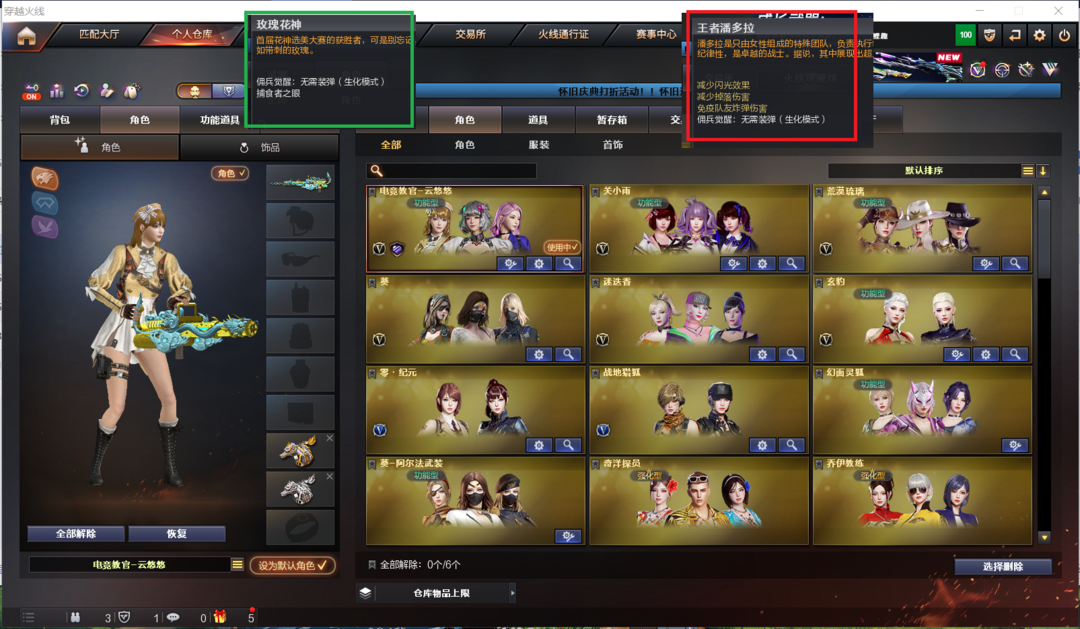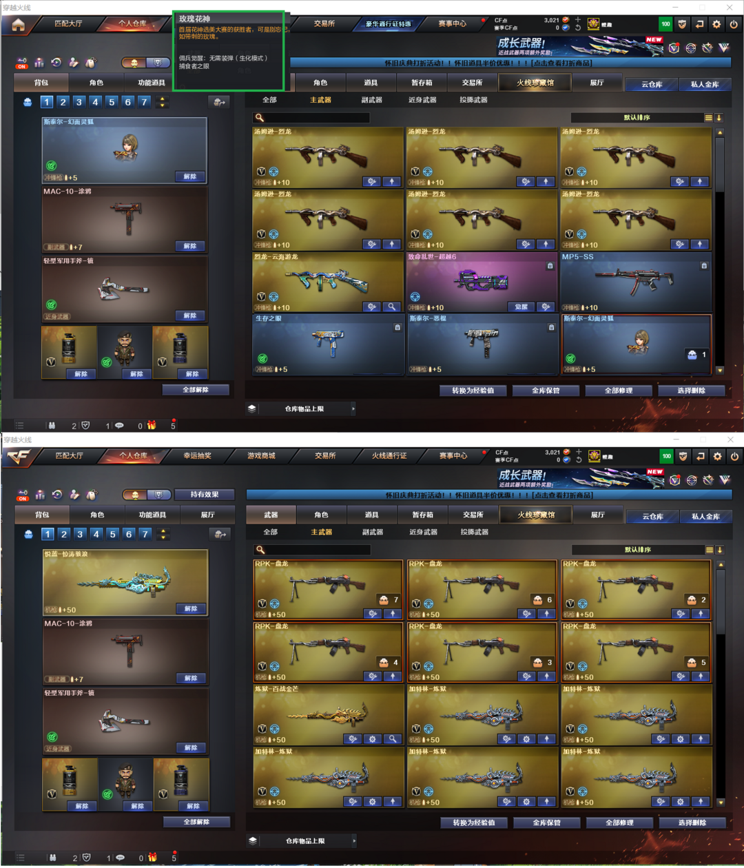 排位:可以、、、、、、、、、生化全装(查看生化僵尸血量):无需换弹、6烈龙、6盘龙、斯太尔幻面灵狐、双面神、死亡之眼、MAC涂鸦、生化减速雷、超级对讲机、全部弹匣、、、、、、、爆破四防:幻神2皮+音效(宠儿、丹凤皮肤)、M200-竞技荣光、USP雷暴、柯尔特竞技荣光、柯尔特-电竞之星、冠军之特、玄豹左轮、QBZ金色蔷薇、、、幻神音效、毁灭音效、、、1套幻灵、4套竞技荣光、、、生化人物(玫瑰花水)爆破四防(云悠悠、王者潘多拉)