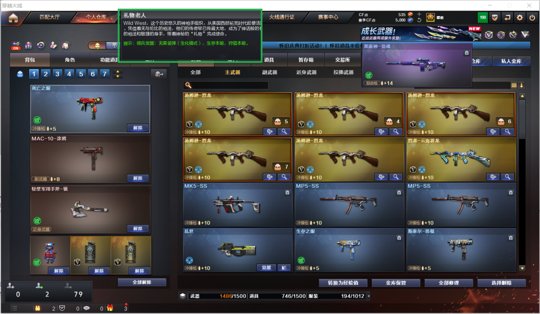 排位:可以、、、、、、、、、生化全装(查看生化僵尸血量):无需换弹、6烈龙、双面神、死亡之眼、MAC涂鸦、生化雷、超级对讲机、全部弹匣、、、、、、、、、、、爆破全装:幻神(N9皮肤)、USP手枪、柯尔特手枪、传说光耀、QBZ金色蔷薇、、、毁灭音效、雷神音效、火麒麟音效、、、1套雷霆、、、生化人物(礼物老人)爆破人物(王者樱-热浪之夏)