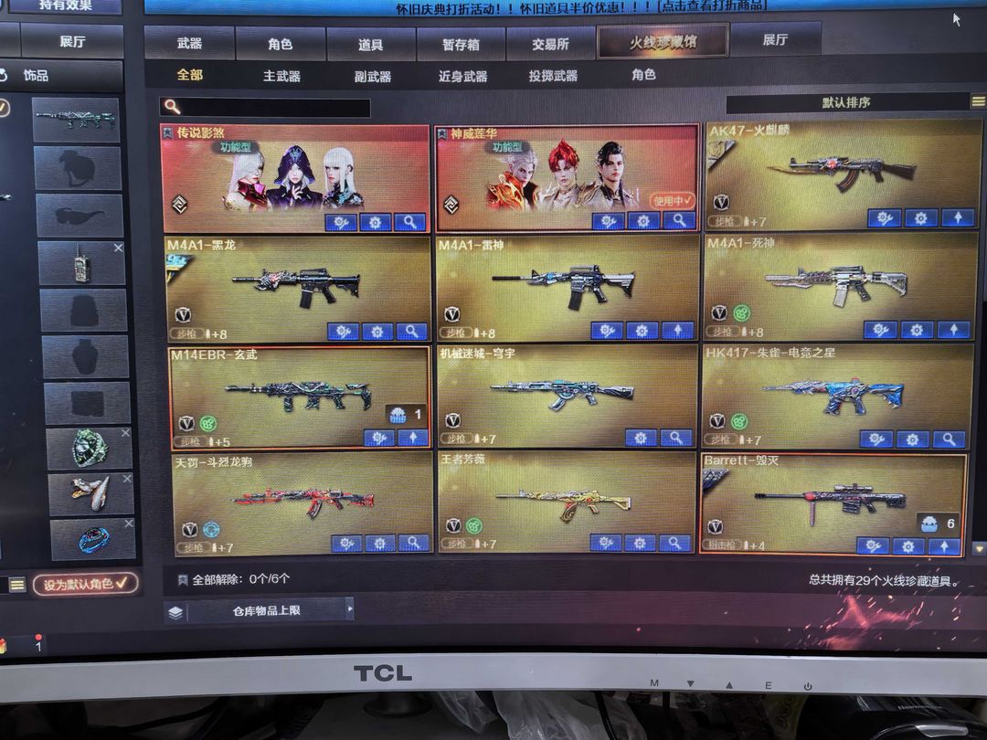生化爆破,神威莲花,传说映煞,蝴蝶刀3把,裁决+音效卡,幻神+皮肤都有,两把加特林,玄武也有。
