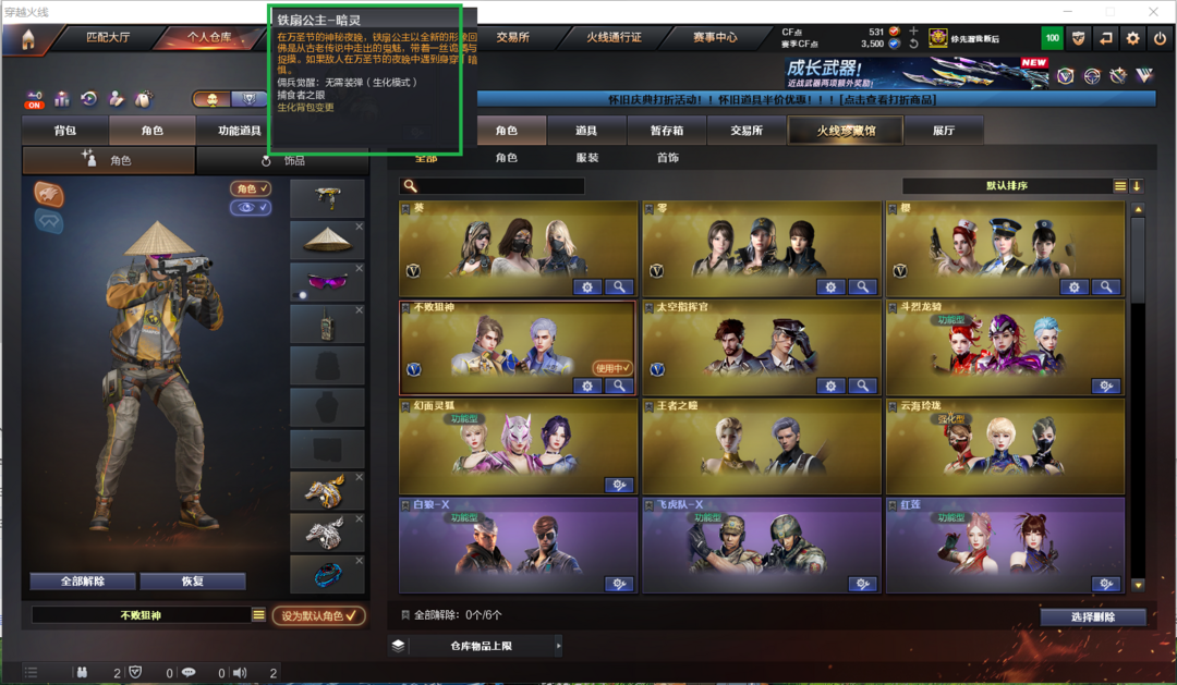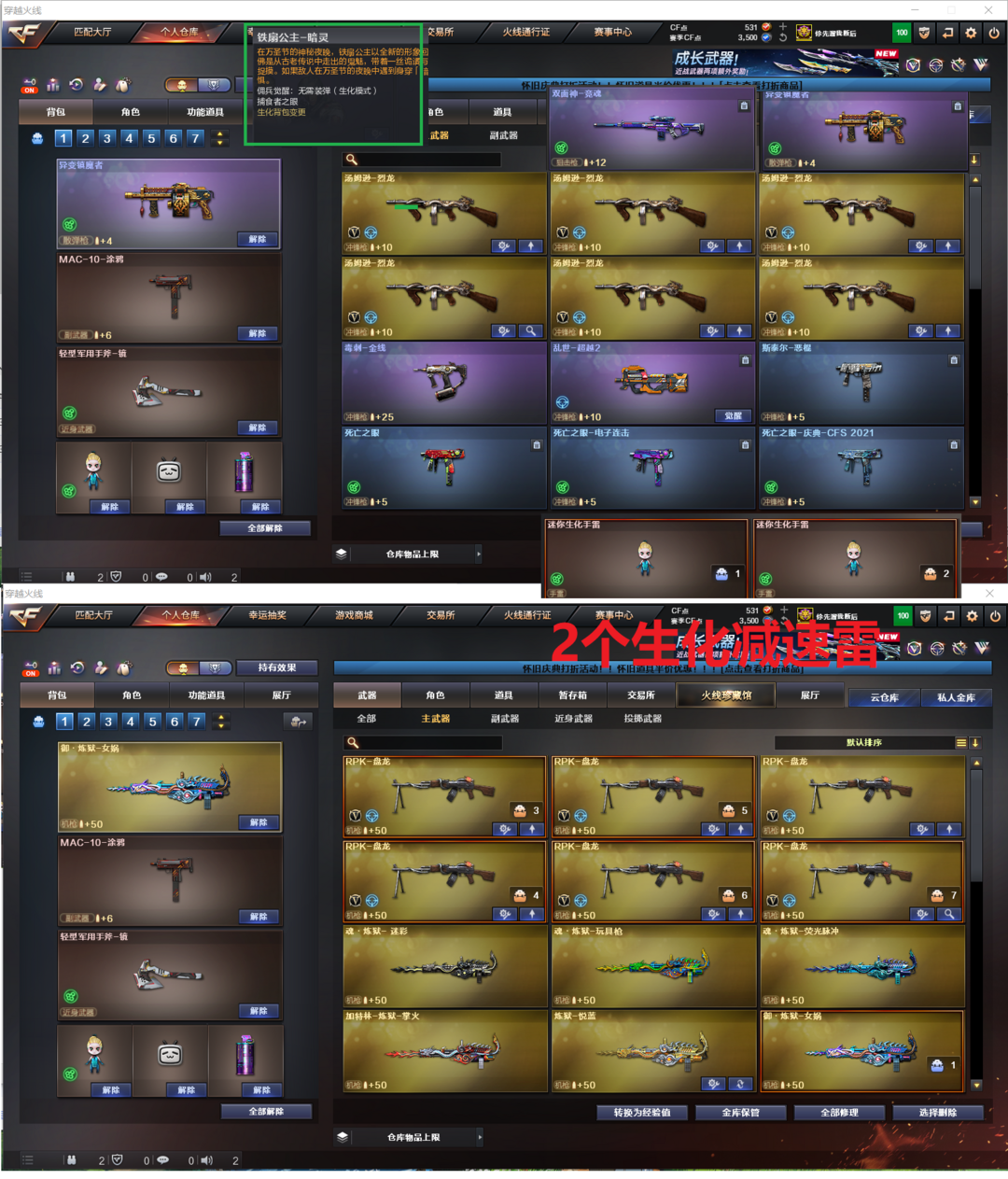 排位:可以、、、、、、生化全装(可以变更背包、查看生化僵尸血量):无需换弹、6烈龙、6盘龙、炼狱、异变镇魔者、双面神、死亡之眼、MAC涂鸦、2个生化减速雷、超级对讲机、全部弹匣、、、、、、、、、、爆破四防:白虎、QBZ金色蔷薇、、、雷神音效、、、生化人物(铁扇公主-暗灵、礼物老人)