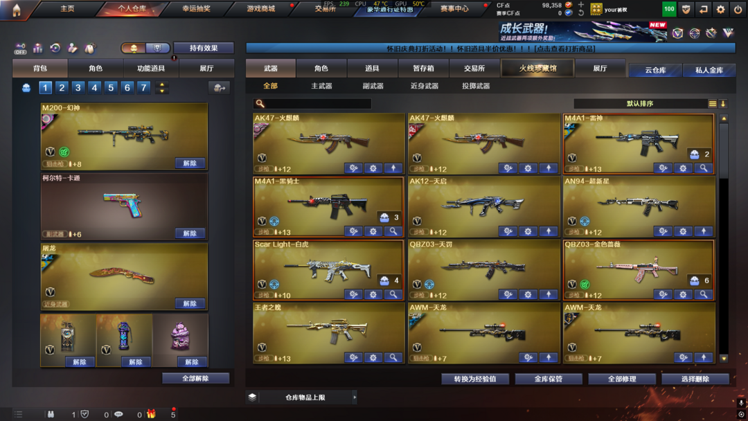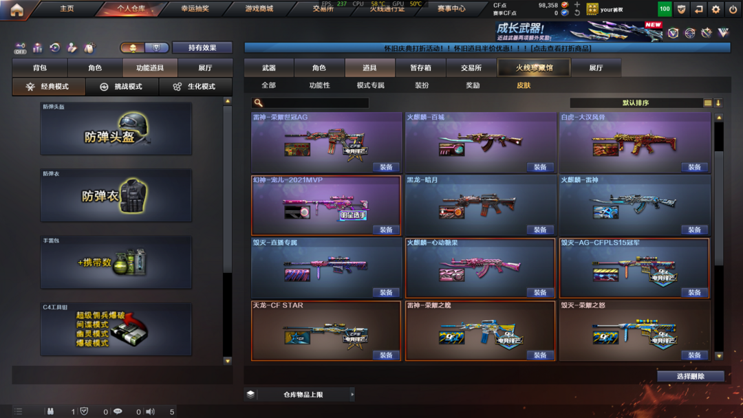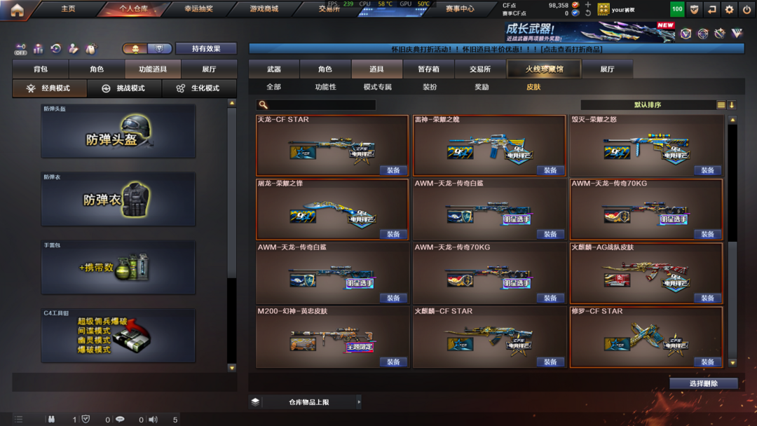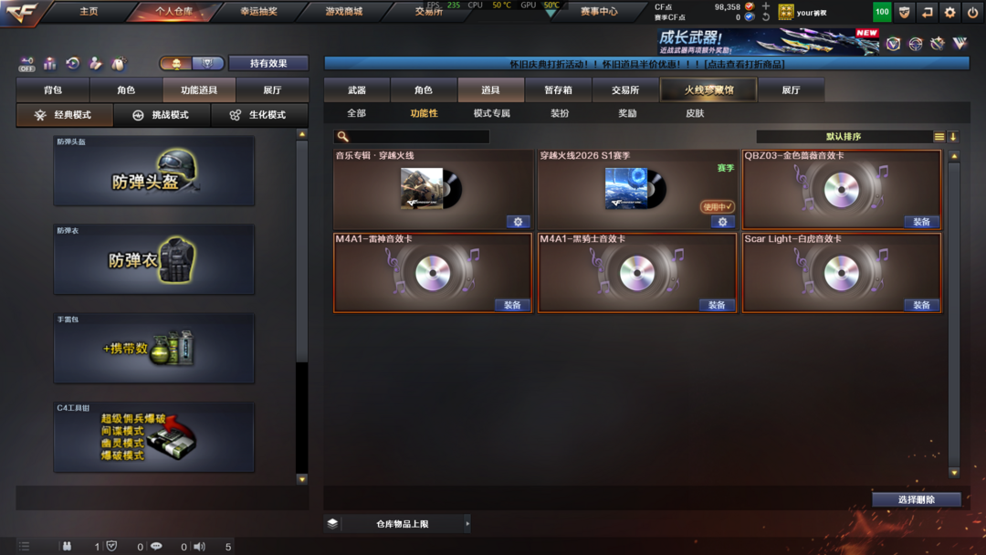 道具:夺命之镰;防化服;全能枪王黄金面具;兔子发带;防弹头盔;烟雾保护头盔;闪光护目镜;C4工具钳;防弹衣;手雷包;天使之翼;京剧背包;黄金头骨护目镜;小萝莉;变相怪杰;小兔皮;防弹头盔;C4工具钳;手雷包;防弹衣;大圣头盔;超级背包;Scar Light-白虎音效卡;M4A1-黑骑士音效卡;M4A1-雷神音效卡;QBZ03-金色蔷薇音效卡