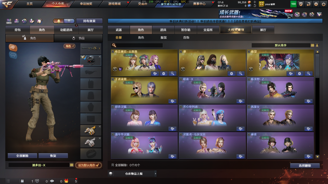 角色:葵;雨棠;电竞教官-云悠悠;潘多拉;幻影;堕天使;救世主;精英部队;灵狐者;暗夜-X;陈龙野-Z;青霞仙子;艾比;妲己;麻雀;圣诞潘多拉-X;王者凌霄;潘多拉-甜心教官;芳心审判者;社长刀锋;风暴女;木兰;嘉年华灵狐;猎狐者-X;斯沃特精英