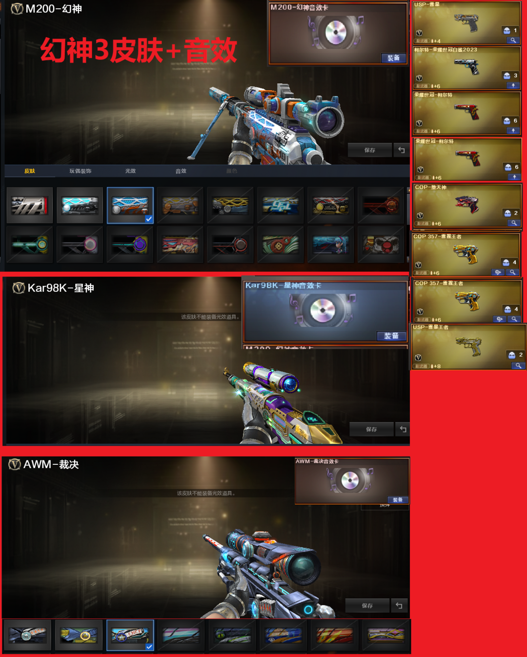 排位:可以------------生化全装(变更背包、看血量):无需换弹、6烈龙、2盘龙、炼狱-泡泡象、斯泰尔蝴蝶、MAC涂鸦、3把炽芒蝶刃、生化减速雷、超级对讲机、生化常用弹匣、、、、、、、、爆破全装:幻神3皮肤+音效(星火小队、星耀、23白鲨)、98K星神带音效、王者幻神、裁决皮肤、、、USP雷暴、USP雷暴王者、COP堕天神、竞技荣光柯尔特、23白鲨柯尔特、COP堕天神、COP雷霆王者、、、G36C幻影、QBZ蔷薇、白虎、传说暗裔、、、幻神音效、裁决音效、星神音效、毁灭音效、黑龙音效、黑骑士音效、、、、1套夜魔、1套幻灵、2套竞技荣光、、、爆破人物(云悠悠、鹰、月兔特工、荒漠琉璃、王者魅影、王者闭月羞花)、生化人物(隼、嘉年华灵狐)