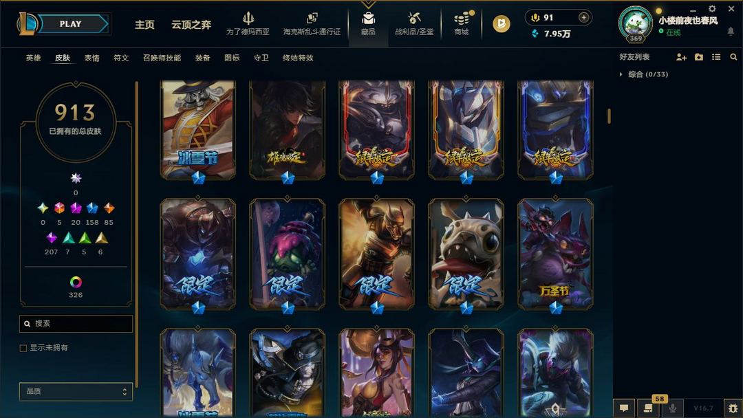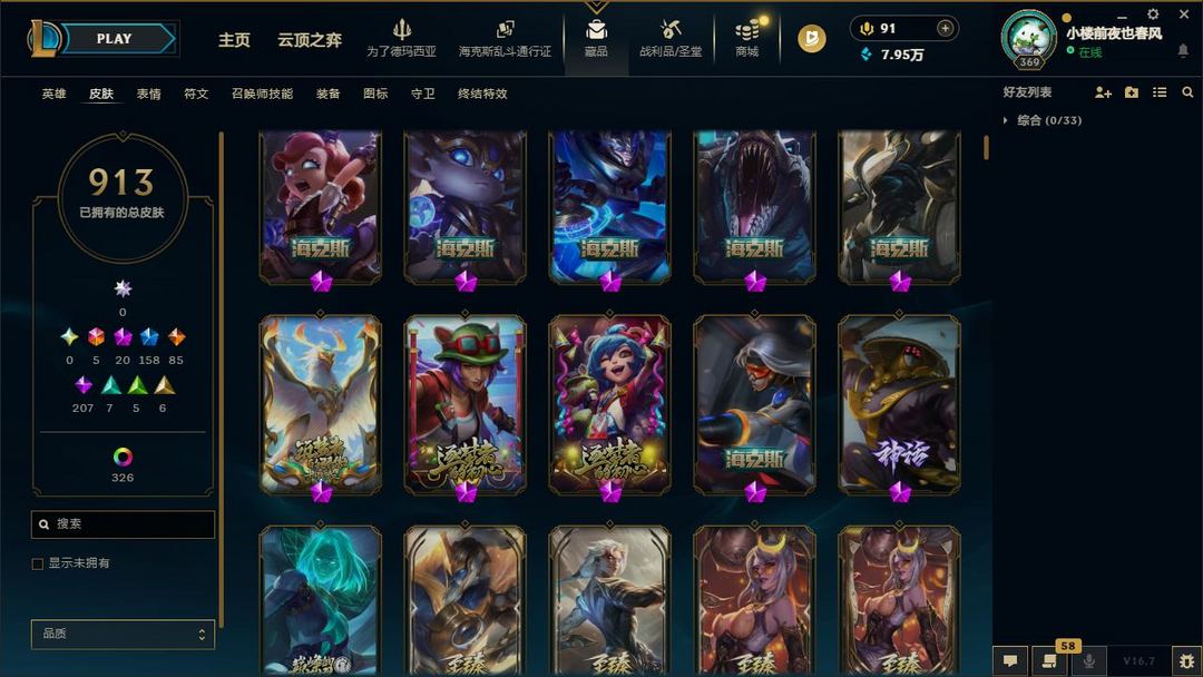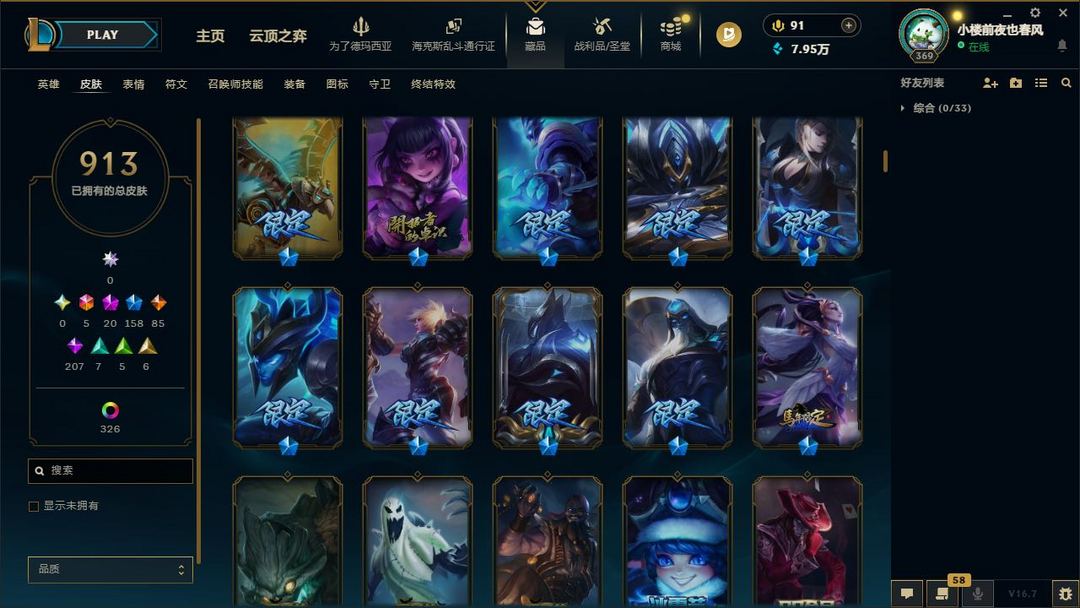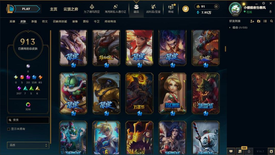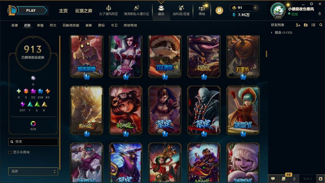 【LOL大王】1300P禁排位乄913原皮乄326炫彩乄21神话乄20神话乄159限定