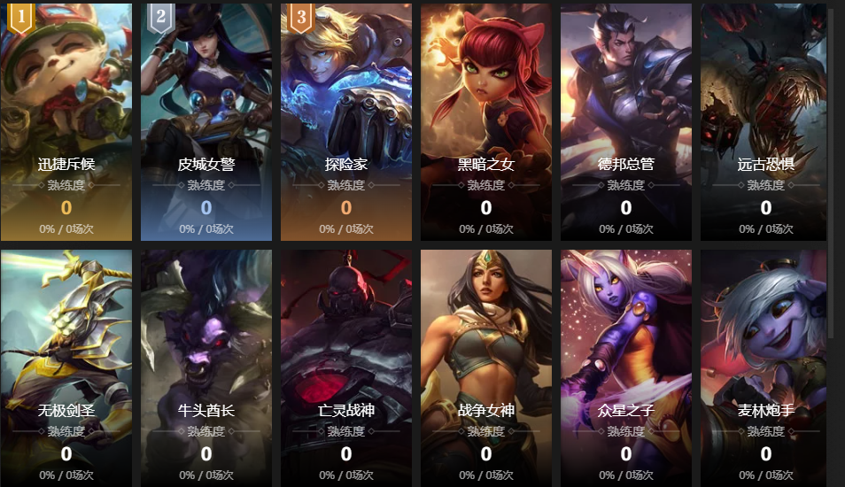 迅捷斥候;探险家;皮城女警;黑暗之女;德邦总管;远古恐惧;无极剑圣;牛头酋长;亡灵战神;战争女神;众星之子;麦林炮手;祖安怒兽;雪原双子;赏金猎人;寒冰射手;蛮族之王;武器大师;堕落天使;时光守护者;痛苦之拥;虚空恐惧;殇之木乃伊;披甲龙龟;祖安狂人;琴瑟仙女;风暴之怒;瓦洛兰之盾;邪恶小法师;蒸汽机器人;熔岩巨兽;扭曲树精;复仇焰魂;盲僧;大发明家;沙漠死神;兽灵行者;圣锤之毅;不屈之枪;铁铠冥魂;德玛西亚之力;曙光女神;光辉女郎;远古巫灵;九尾妖狐;潮汐海灵;不灭狂雷;北地之怒;爆破鬼才;战争之影;诺克萨斯之手;皎月女神;暗黑元首;荆棘之兴;虚空之女;疾风剑豪;弗雷尔卓德之心;戏命师;暴走萝莉;圣枪游侠;影流之主;元素女皇;皮城执法官;唤潮鲛姬;魔法猫咪;魂锁典狱长;腕豪