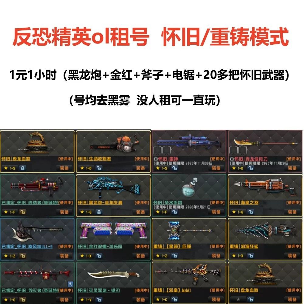 弑神+邪皇+海皇+盘龙+电锯+升级全+黑龙炮+金红+斧子等30多把怀旧武器