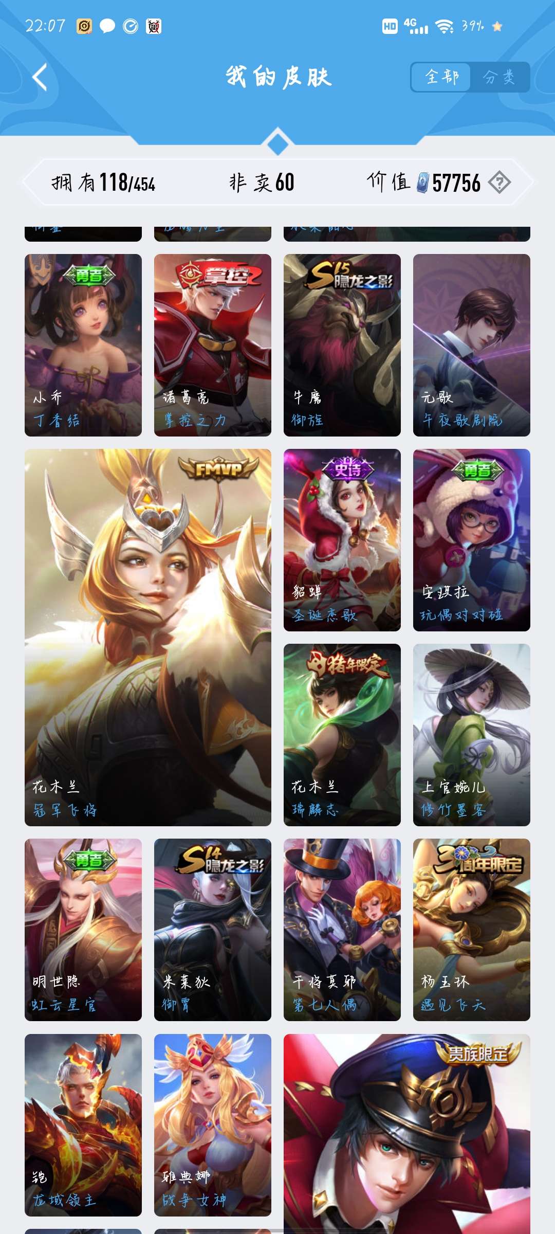 本游戏账号: ,英雄多,皮肤多。FMVP皮肤1个,尽情享受FMVP皮肤带来的主角光环, 私人所属英雄皮肤有:花木兰 冠军飞将孙悟空 至尊宝||花木兰 瑞麟志||达摩 沙漠行僧百里守约 特工魅影||貂蝉 圣诞恋歌||雅典娜 冰冠公主,等等