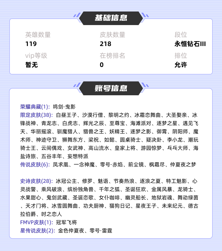 本游戏账号: ,英雄多,皮肤多。典藏皮肤1个,感受典藏皮肤带来的优质体验快感,FMVP皮肤1个,尽情享受FMVP皮肤带来的主角光环, 私人所属英雄皮肤有:李白 鸣剑·曳影李信 一念神魔||李白 凤求凰||孙悟空 零号·赤焰||娜可露露 前尘镜||貂蝉 仲夏夜之梦||橘右京 枫霜尽花木兰 冠军飞将鲁班大师 乓乓大师||达摩 沙漠行僧||关羽 冰锋战神||杨玉环 遇见飞天||上官婉儿 梁祝||孙悟空 至尊宝||孙悟空 大圣娶亲||鬼谷子 五谷丰年||李元芳 妄想特派||安琪拉 如懿||庄周 高山流水||明世隐 疑决卦||桑启 海盐诗旅||太乙真人 华丽摇滚||韩信 逐梦之影||嬴政 白昼王子||狄仁杰 魔术师||狄仁杰 阴阳师||后羿 辉光之辰||百里玄策 白虎志||米莱狄 御霄||元歌 云间偶戏||项羽 海滩派对||赵云 皇家上将||鲁班七号 狮舞东方||干将莫邪 冰霜恋舞曲||甄姬 游园惊梦||艾琳 女武神||盾山 圆桌骑士||裴擒虎 李小龙||铠 青龙志||雅典娜 黎明之约||