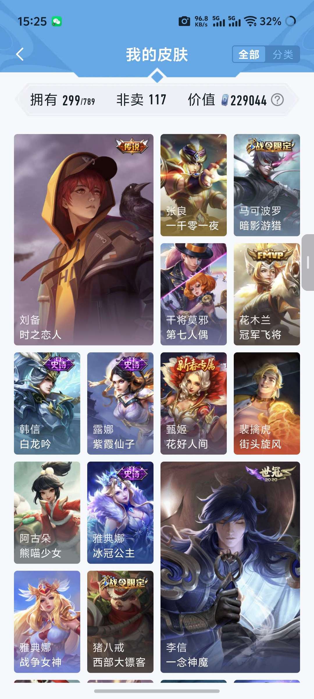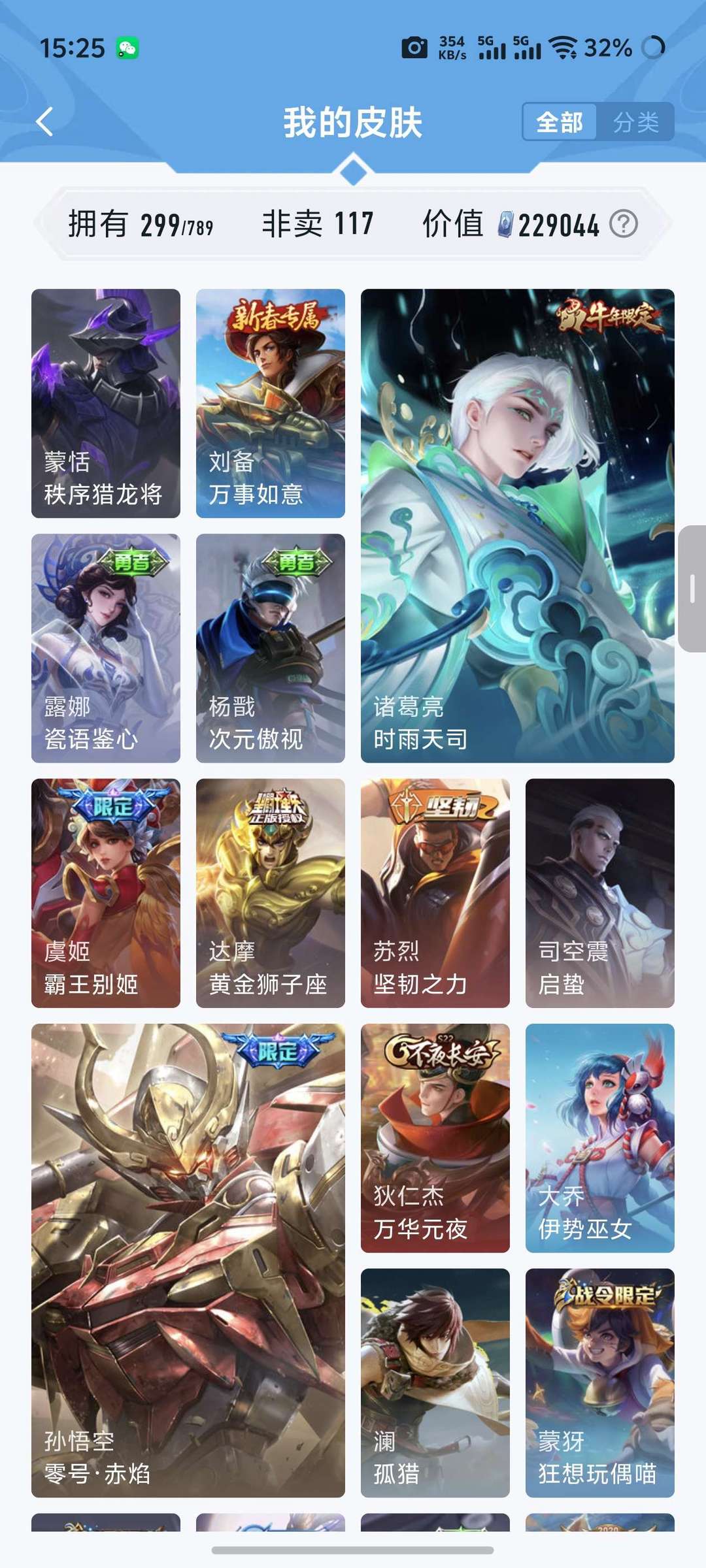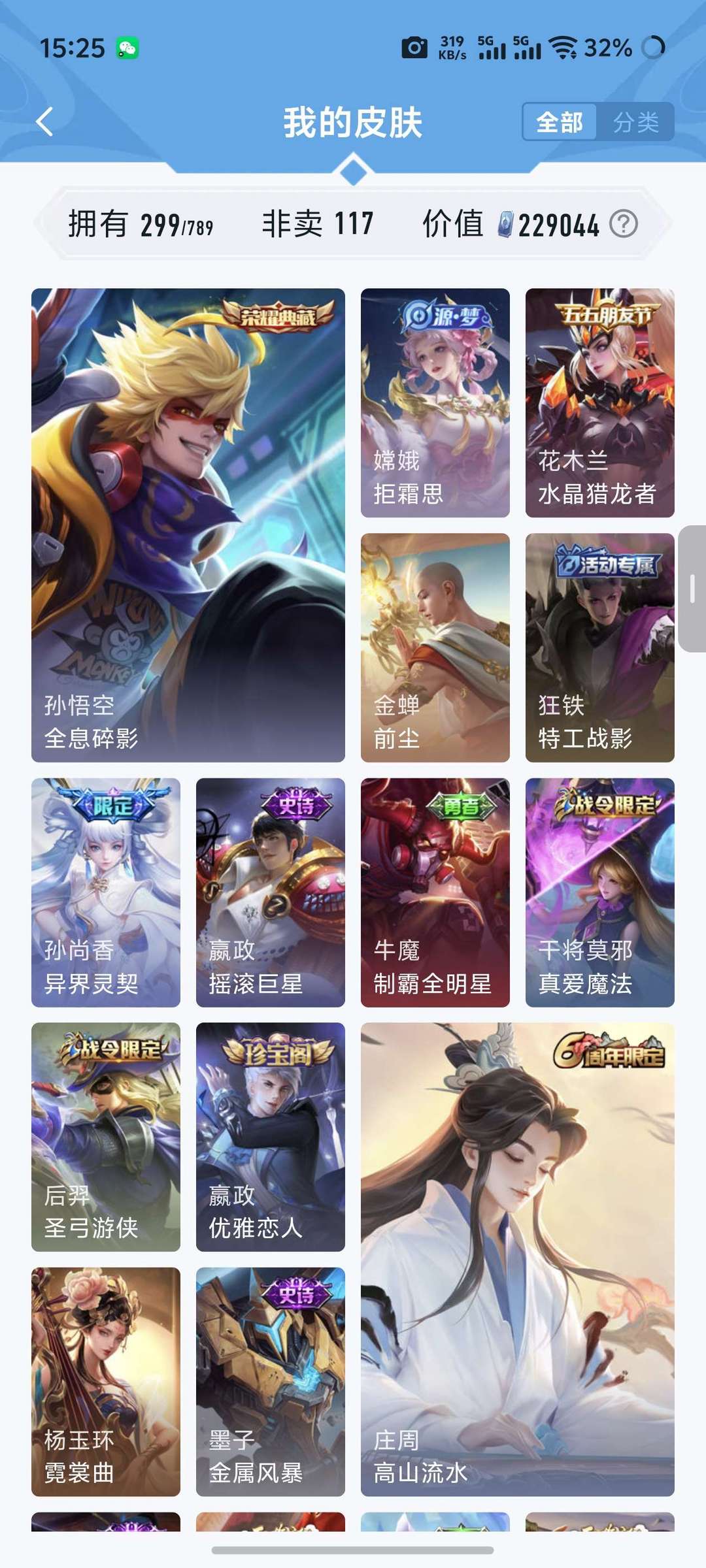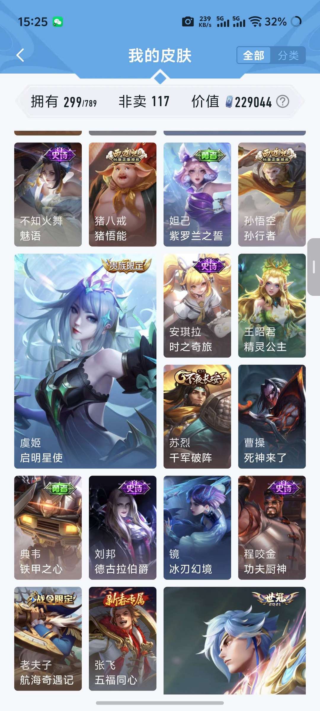1个典藏,84个史诗,23个传说,133个勇者,16战令,39赛季,103活动限定,7个周年,全铭文
