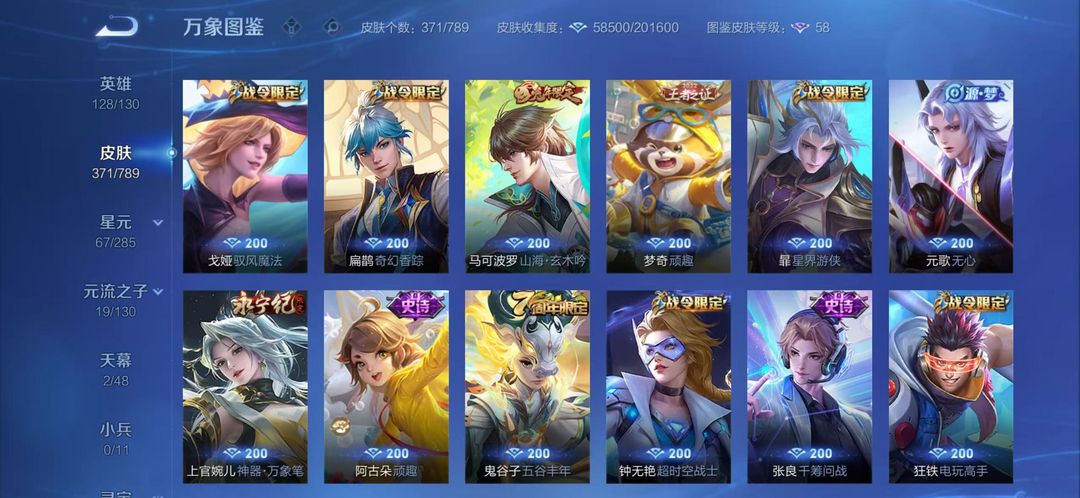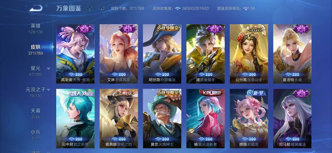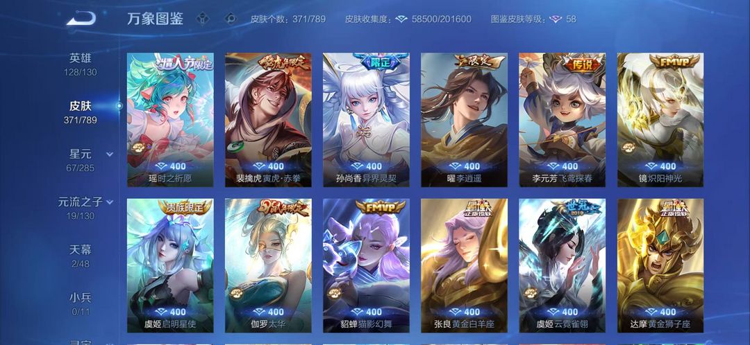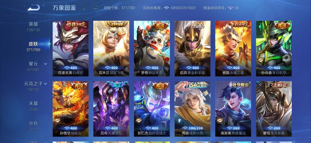 371皮肤3典藏 30传说皮肤 111史诗皮肤 8年限皮 10生肖限定 省级老虎李信孙尚香 福段位星耀5 带妹爽号