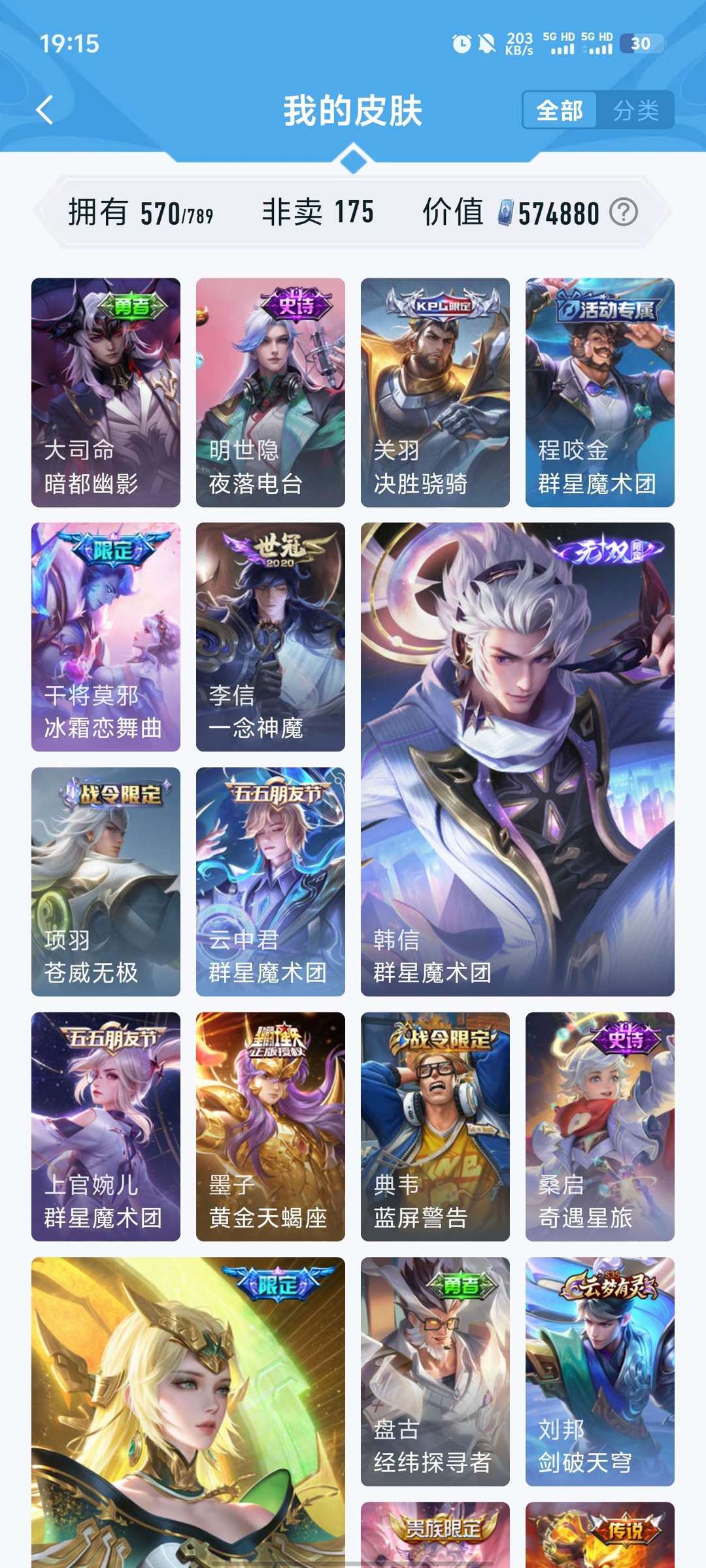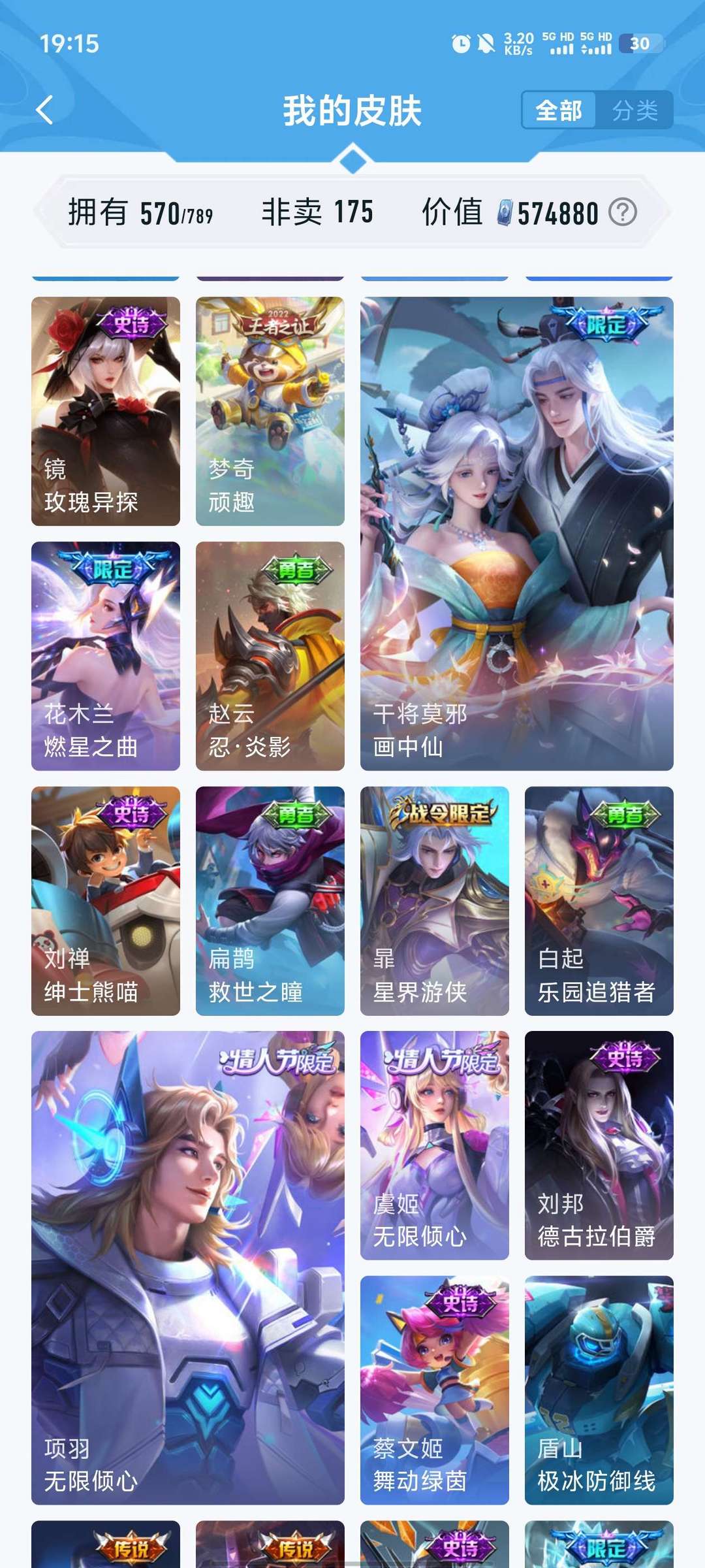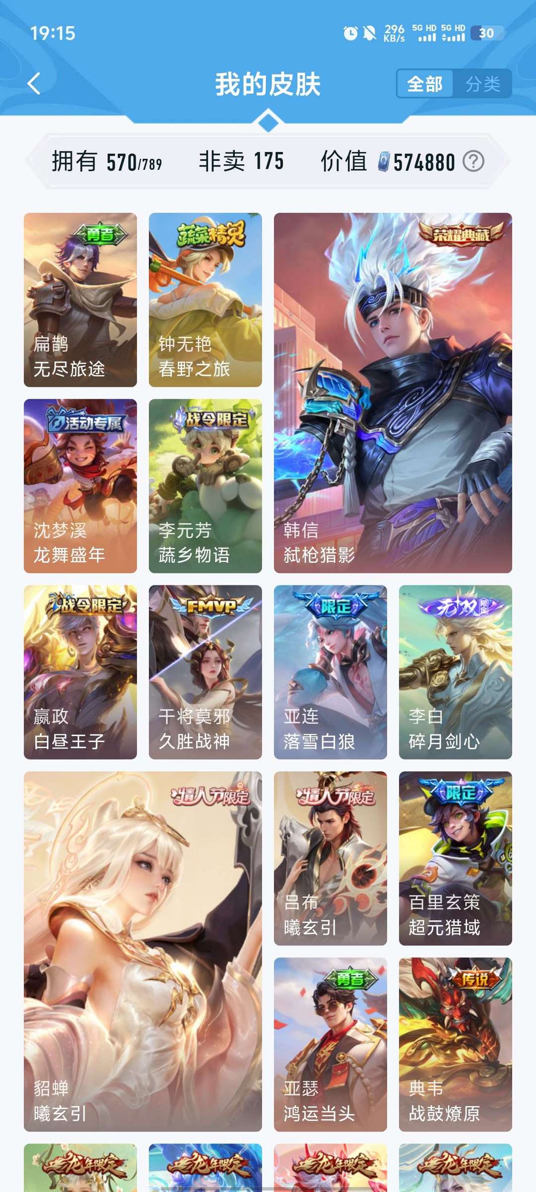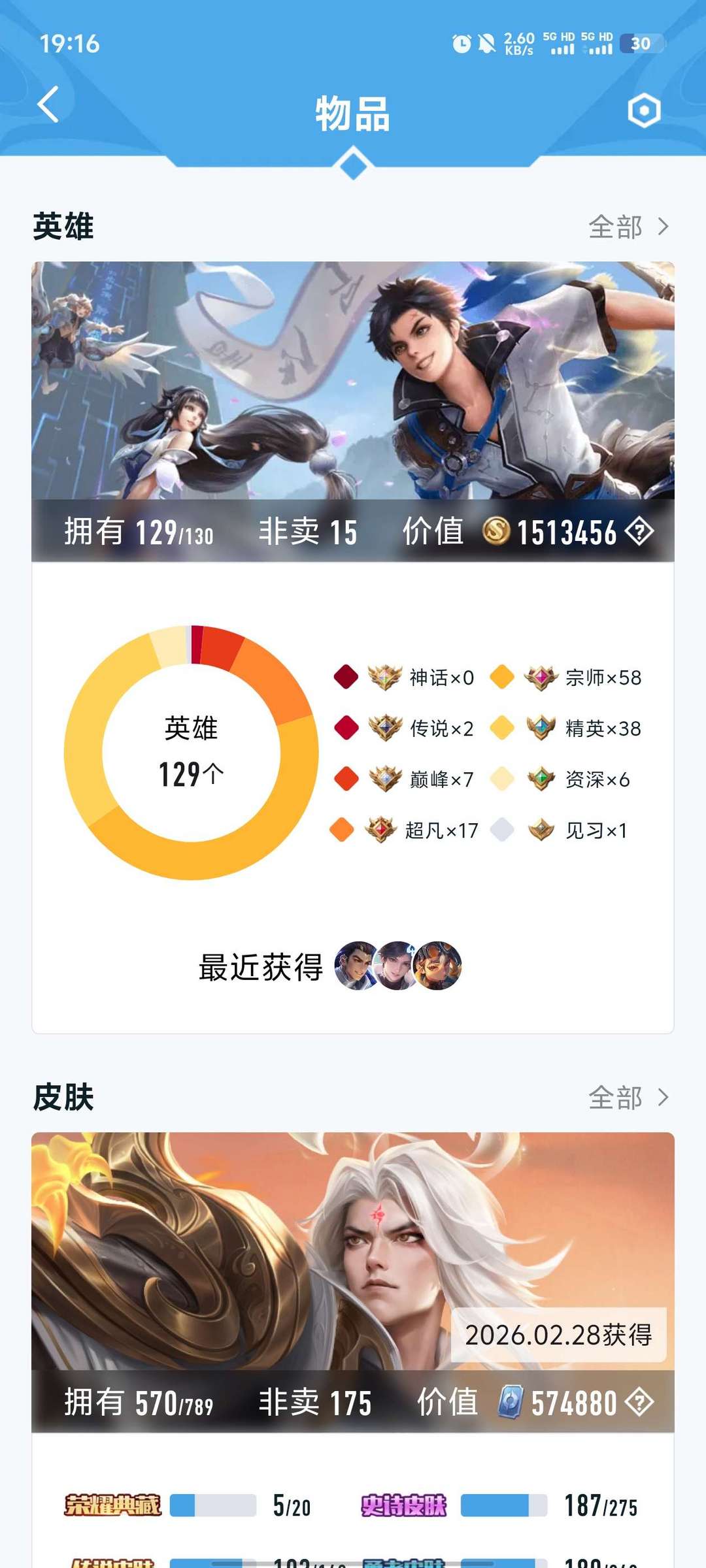129 英雄+570 皮肤+满级铭文+段位本赛季未打
