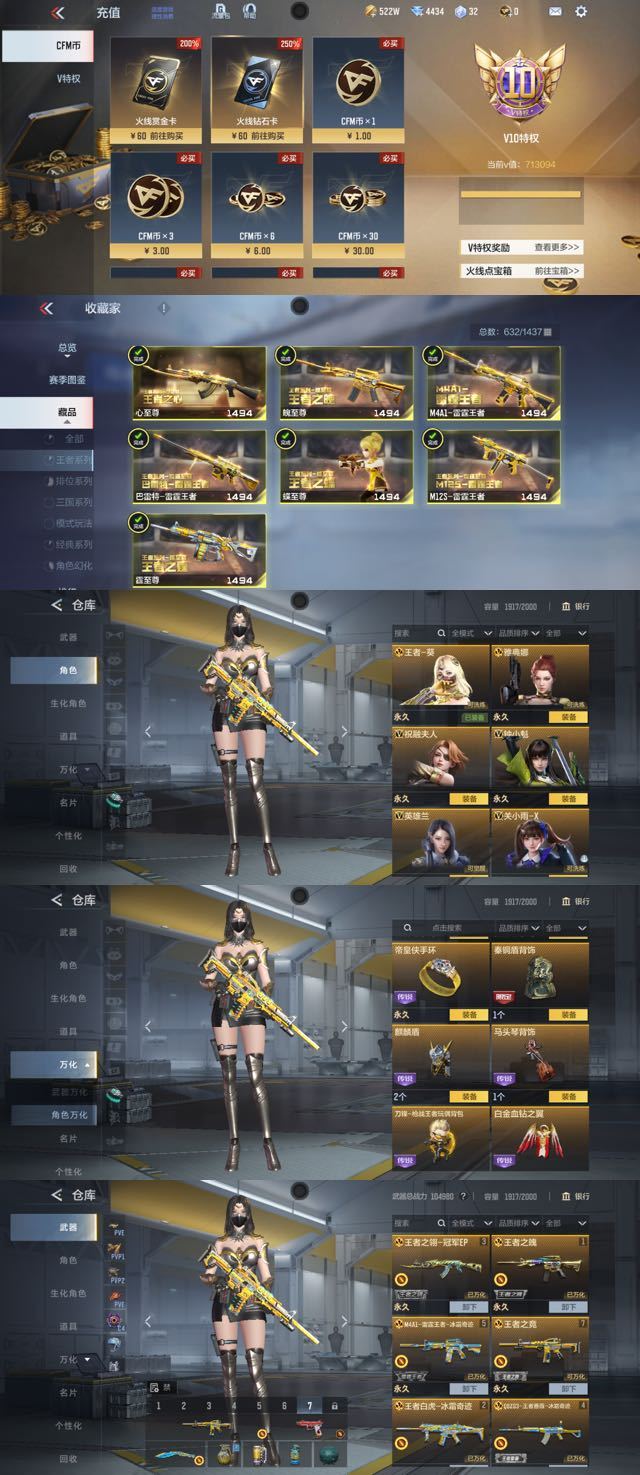本游戏账号:英雄武器242个, 王者武器32个。军衔: 大元首,拥有:萝拉,樱,云悠悠,等12个角色。装备齐全让你拥有完美游戏初体验,特殊装备有:巴雷特-毁灭、王者之心、王者之神、王者之迹、王者之魄、王者之影闪光弹、王者之影烟雾弹、王者之击、王者之势烟雾弹、王者之魂、王者之怒、巴雷特-极光、黑武士手雷、王者之烈、MK47-机械纪元、火麒麟烟雾弹、黑武士烟雾弹、王者之翼烟雾弹、幻兽烟雾弹、幻兽闪光弹、MK5-机械纪元、沙鹰-竞技战魂、巴雷特-雷神、尼泊尔-雷霆、源·巴雷特-毁灭、巴雷特-金色蔷薇、黑武士闪光弹、火麒麟手雷、火麒麟闪光弹、M4A1-七色宝葫、王者之戮、地狱烈炎、王者之心闪光弹、王者之刺、虎头湛金枪、巴雷特-变色龙、王者之影、王者之圣闪光弹、手斧-竞技战魂、激光毁灭者Ⅲ、王者之光、尼泊尔-竞界荣光、81式-光明之神、王者之圣手雷、尼泊尔-星象、AWM-妙才、剑齿虎-炫彩、王者之心手雷、王者之心烟雾弹、王者之翼闪光弹、MK5-极光、烟雾弹-雷暴、闪光弹-雷暴、左轮-黑武士