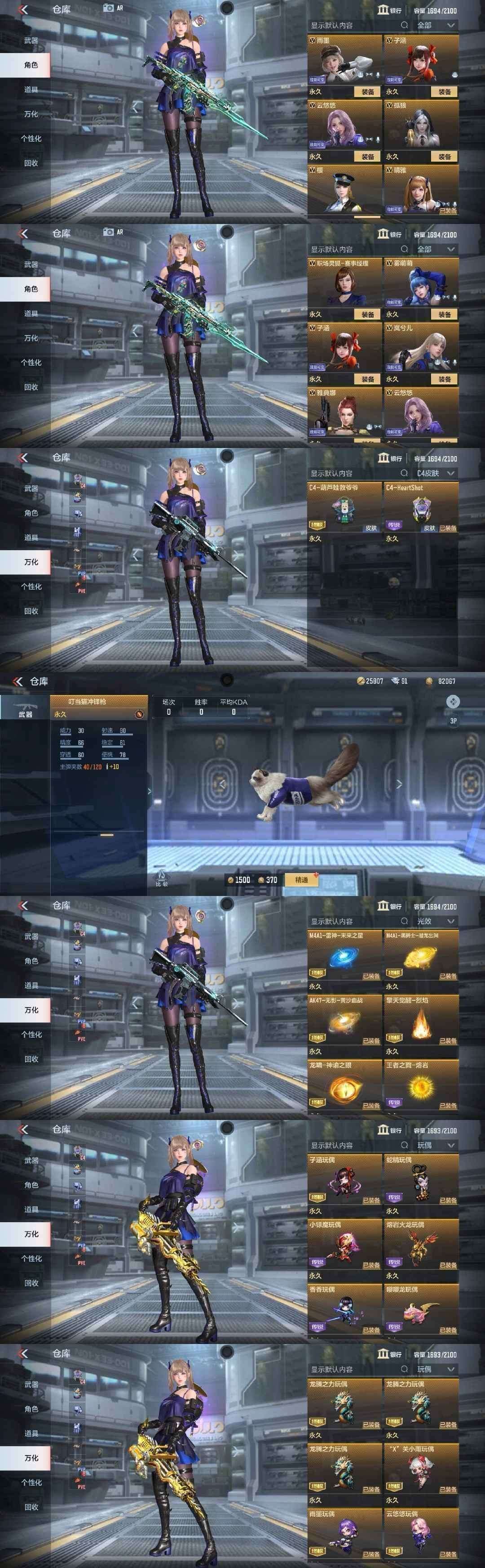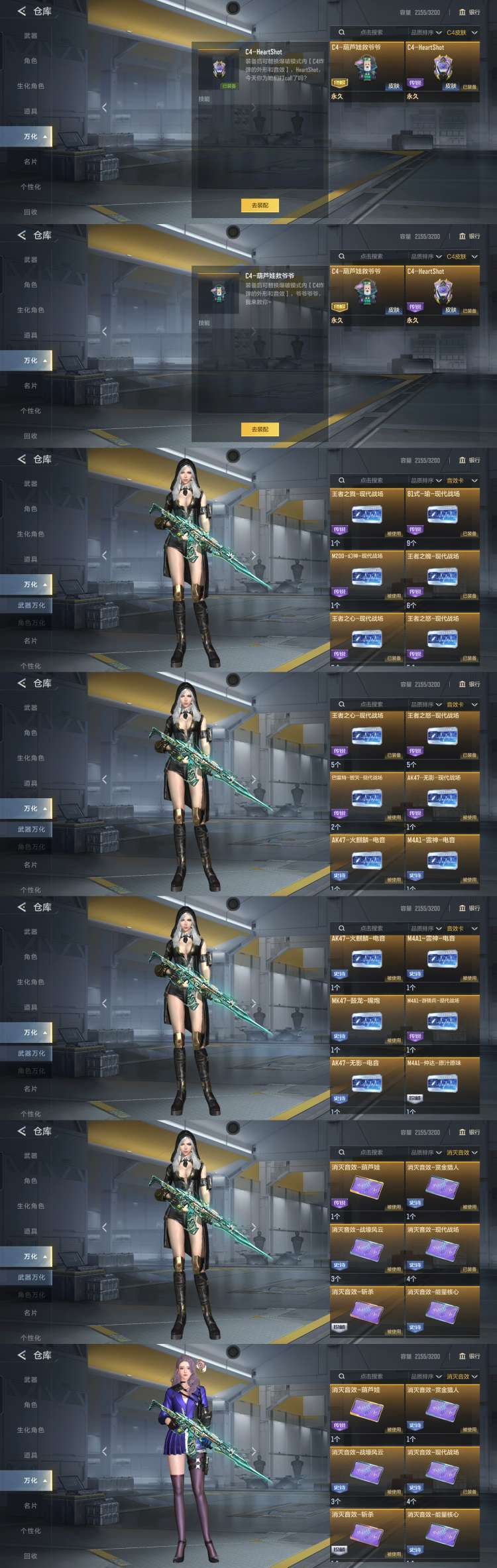 仲康,叮当猫冲锋枪,云舞,03死神,星象,仁德,幻神,雷霆m4,文远,雷神巴雷特,9a91死神,斩神刀,周瑜套,黑耀宝葫葫芦娃套,定军套,黑龙血煞,竞技战魂斗鱼,火麒麟玉门春风套,黑武士觉醒套,无影套,毁灭套等